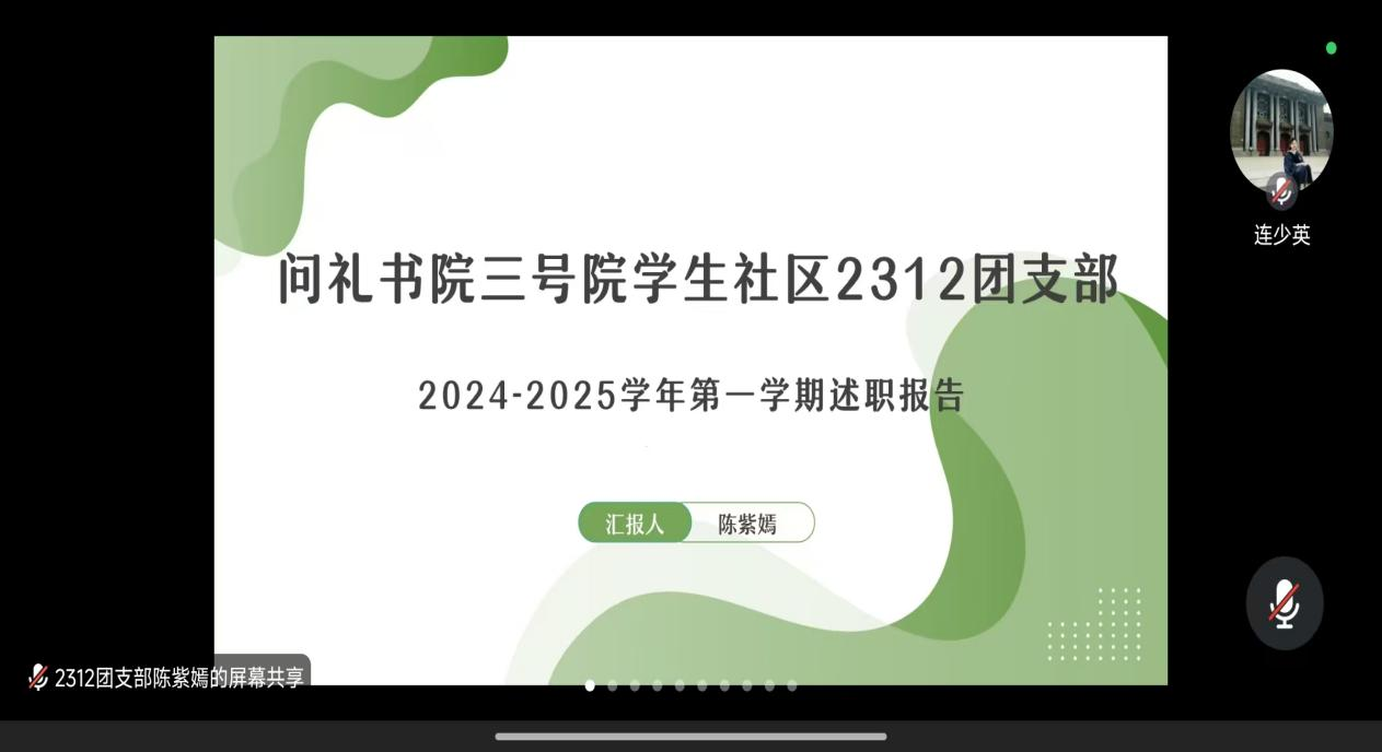 为深入学习习近平总书记关于青年工作的重要思想,切实加强基层团组织建设,全面落实从严治团的工作要求,2025年1月13日,问礼书院3号学生社区团委通过线上会议的方式召开了2024年度基层团组织书记述职评议会。书院团委书记连少英、育人导师洪东方、各基层团支部书记、支委代表及团员代表参与了此次会议。