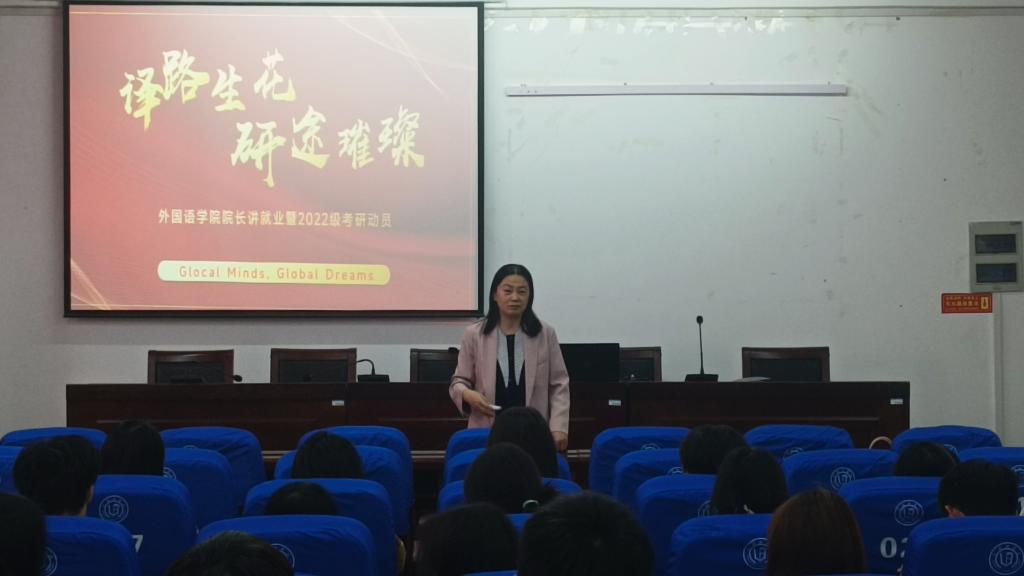 4月25日下午,外国语学院副院长贺剑瑜以“译路生花,沿途璀璨——Global Minds, Global Dreams”为题,为2026届毕业生开展就业与考研动员专题讲座。讲座围绕“底气”“优势”“意义”及“行动”四个方面,为处于升学就业关键期的学生明晰方向、提振信心。
