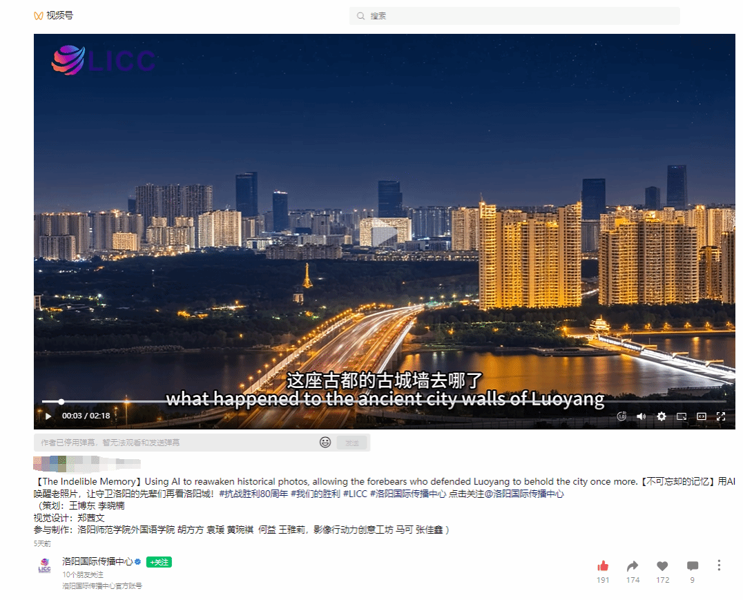 2025年9月3日,为纪念中国人民抗日战争暨世界反法西斯战争胜利80周年,洛阳国际传播中心发布了《让守卫洛阳的先辈们再看洛阳城》AIGC短视频集,并在多个海外平台同步播出。我院日语专业师生团队(胡方方、袁瑗、黄琬祺、何益、王雅莉)参与制作,承担并完成了文案撰写与翻译、历史影像修复与活化、剪辑与包装等多项重要任务。