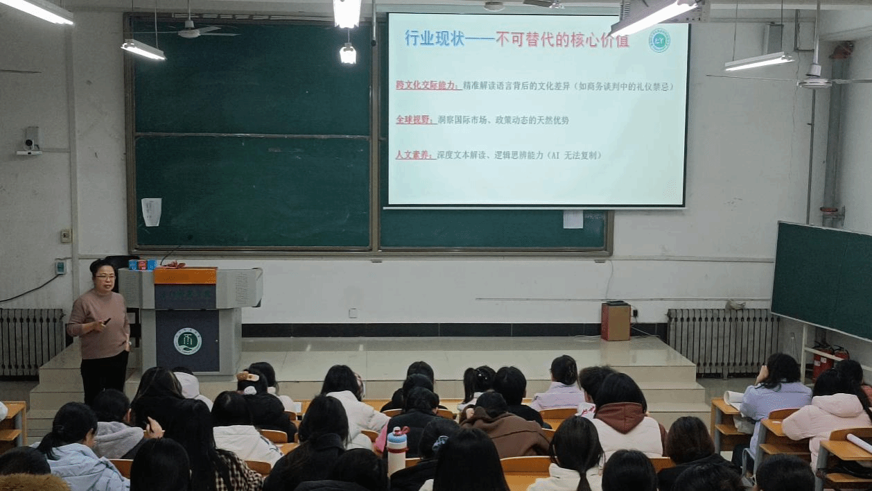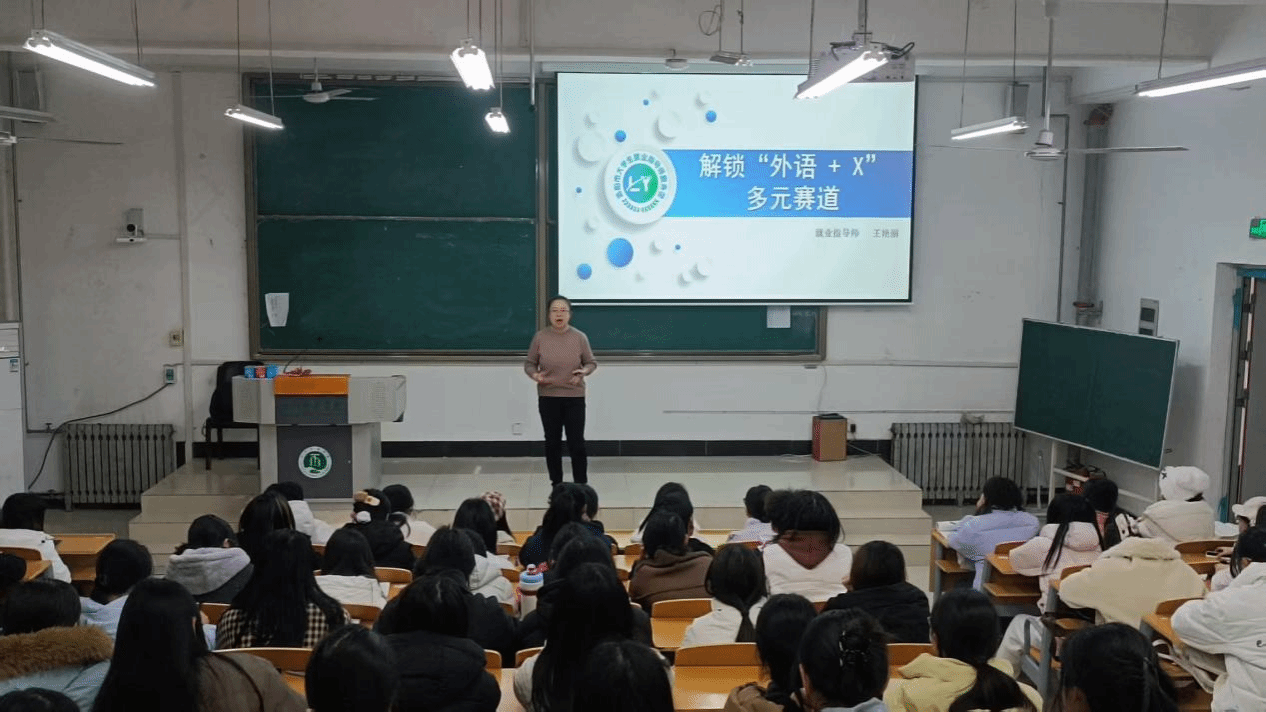 2025年12月4日下午,我院邀请洛阳市人力资源和社会保障局大学生就业指导师服务团成员、国家高级企业人力资源管理师王艳丽老师,在A1-101阶梯教室为大一新生作题为《解锁“外语+X”多元赛道》的讲座。