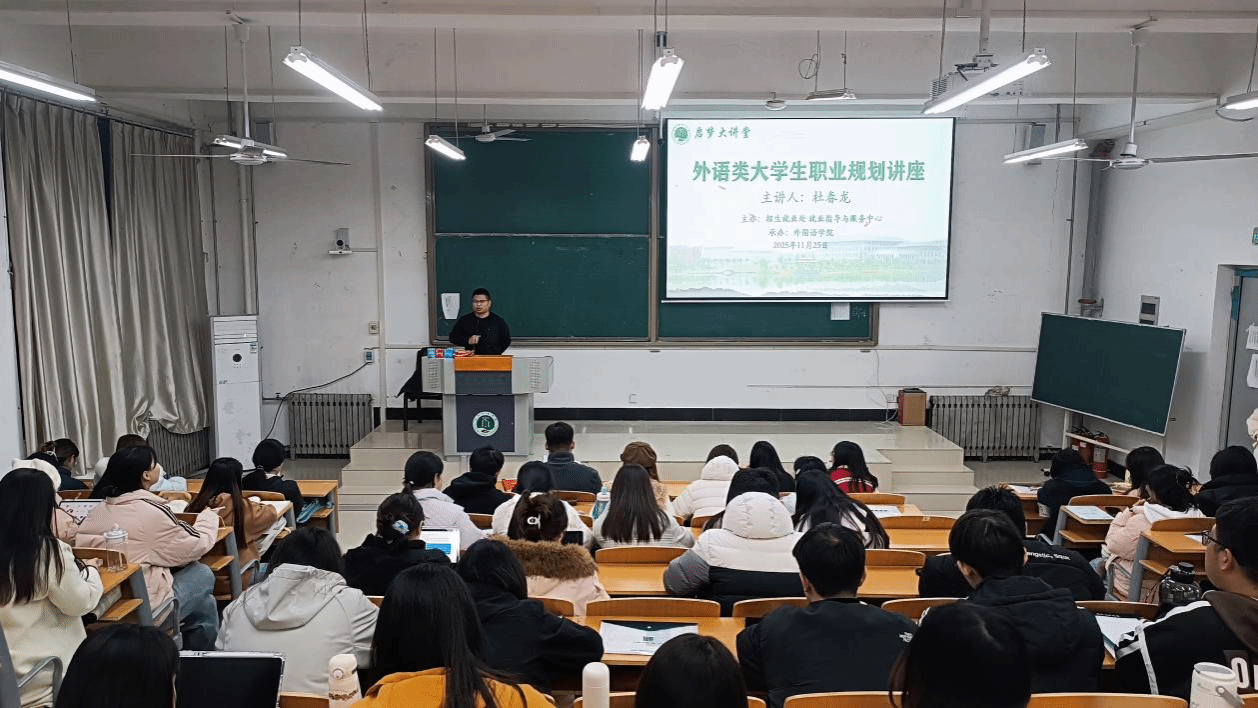2025年11月25日,我院特邀洛阳曌瑞教育科技有限公司杜春龙老师为全体大三翻译专业学生作题为《翻译人才未来发展出路在哪里》的专题就业指导讲座。