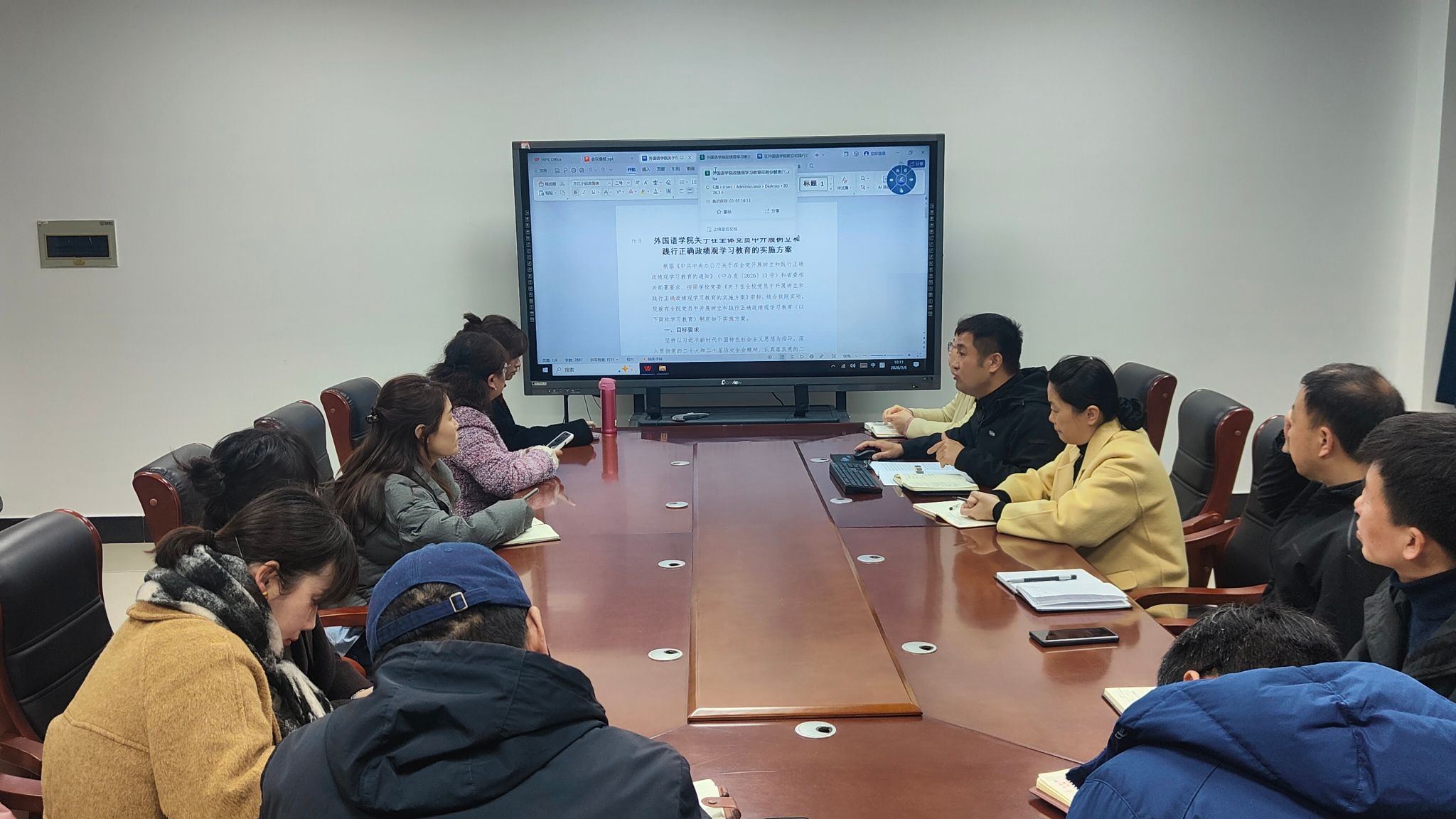 会议强调,要聚焦“学深悟透”,建立“党委领学、专题辅学、支部研学、个人自学”四学联动机制,依托理论学习中心组、“三会一课”、主题党日等载体,深入学习习近平总书记关于树立和践行正确政绩观的重要论述,结合新文科背景下外语学科建设实际,推动理论学习入脑入心。要聚焦“真查实改”,对标总书记重要论述和师生期盼,通过座谈访谈、走访调研、线上意见箱等渠道深挖问题,建立整改台账,对教学管理、科研评价、师德师风等方面的突出问题集中整治。要聚焦“常态长效”,健全党员联系服务师生机制,完善考核评价体系,把正确政绩观贯穿学科建设、人才培养、社会服务全过程。要聚焦“开门教育”,建立民生事项清单,着力解决师生急难愁盼问题,以实绩实效检验学习教育成果。