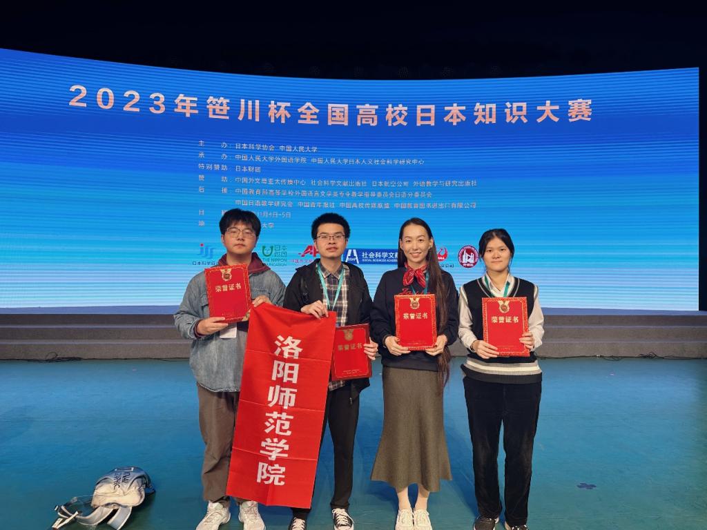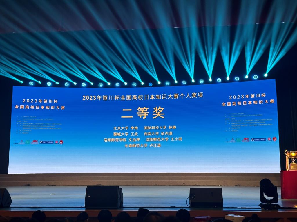 2023年11月4日和5日,由日本科学协会和中国人民大学共同主办的2023笹川杯全国高校日本知识大赛在中国人民大学成功举行。本次比赛共有全国近百所高校的300名选手参赛,题目涵盖日本语言、文学、社会、经济、文化、天文、地理、政治、历史等各个方面。我院2021级日语专业的文治坤、吴若婷、曹劲三名同学,在郭蕊老师的带领下参加了比赛。经过一天半的激烈角逐,文治坤同学一路过关斩将,最终脱颖而出,进入12人决赛,并获得个人二等奖。同时,文治坤和吴若婷、曹劲三名同学一起,获得团体优秀奖,郭蕊老师荣获杰出指导教师奖。