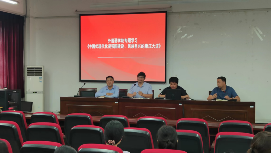 会议强调,中国式现代化,是中国共产党领导的社会主义现代化,既有各国现代化的共同特征,更有基于自己国情的鲜明特色。习近平总书记指出,“中国式现代化,是我们为如何唤醒‘睡狮’、实现民族复兴这个重大历史课题所给出的答案”。广大教职工要全面学习领会,深刻理解中国式现代化的中国特色、本质特征、丰富内涵、重大原则、实践要求和重要意义,与深入学习领会习近平新时代中国特色社会主义思想和党的二十大精神紧密结合起来,不断增强政治自觉理论自觉和行动自觉,全面贯彻落实,把准学校学院中心工作,为学校建设成为特色鲜明的地方高水平大学贡献外院力量。