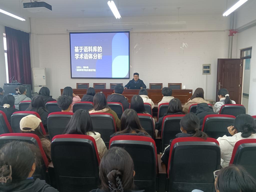 11月10日下午,我院梅中伟副教授在302会议室作“基于语料库的学术语体分析”讲座,讲座由贺剑瑜副院长主持,我院100余名学生参加了此次讲座。