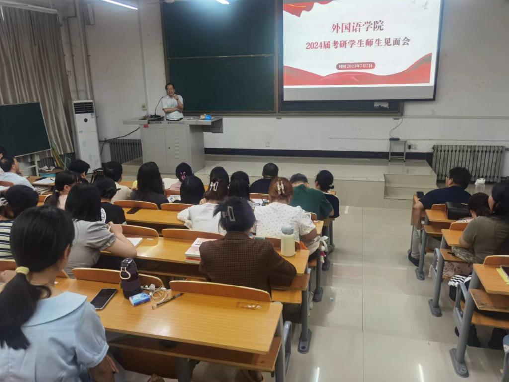 为助力学院2024届本科生全面做好考研备考工作,做到科学选择目标学校、精细做好复习计划、全面解决专业难点疑点、合理做到舒心高效学习,从而不断增强同学们考研信心,7月7日上午,我院在外语楼101教室召开2024届考研学生师生见面会。学院党委书记李广、副院长刘启成、副书记陈朝魁,全体考研指导教师、毕业班辅导员老师和2020级全体同学参加了大会。大会由陈朝魁主持。
