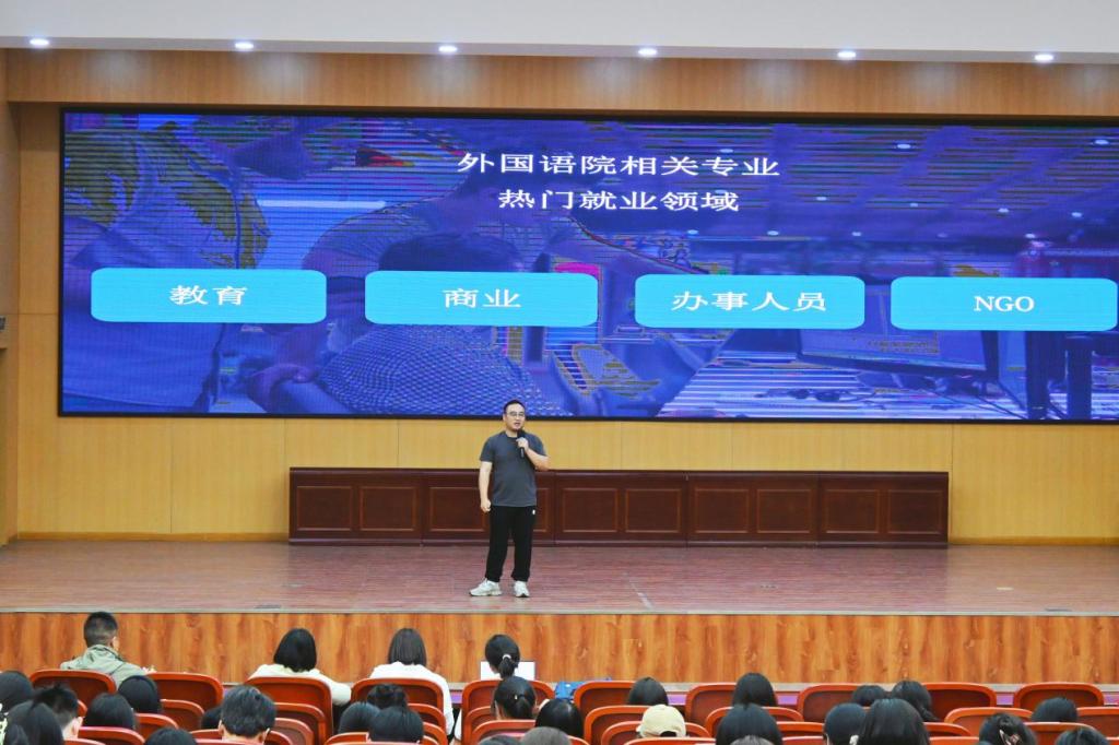 讲座伊始,张艺博以深入的行业洞察和丰富的数据为支撑,剖析当下本科生就业升学形势,系统总结了外语学子就业发展具有多样性特点,重点强调了专业能力的突出地位。随后,他根据当下就业形势复杂且多变的现状,鼓励同学们平时要关注自身专业知识的积累和综合素养的提升,明确指出了丰富自身校园实践经历和实习经历的必要性和重要性。最后,他聚焦升学话题,详细讲解了大学期间的学业规划、学历提升及职业规划,帮助同学们梳理个人发展路径。随后,贺然进行了总结讲话,她希望同学们能够以此次讲座为契机,深入思考自己的规划并与家长老师认真沟通,做好个人发展规划,通过不懈奋斗最终实现目标。