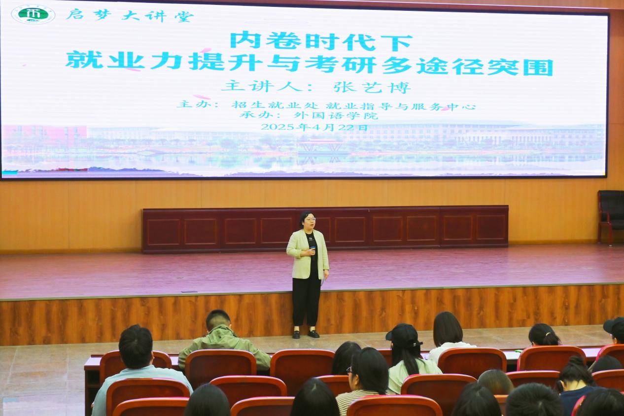 我院于4月22日在逸夫楼G1-112举办题为“内卷时代下就业力提升与考研多途径突围”的专题讲座。讲座由新东方在线名师张艺博担任主讲,学院党委副书记贺然主持。班主任、育人导师及2024级全体学生参加。