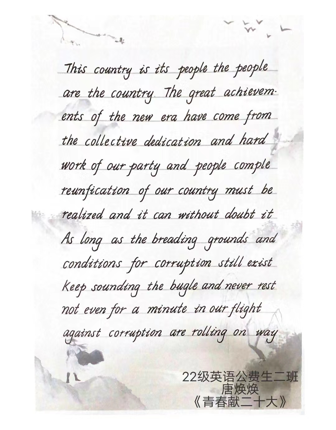 本次比赛分为钢笔字、粉笔字、毛笔字三个部分,书写的语种为中英文。活动期间,同学们以极大的热情和认真的态度参与了这次活动。评委老师按照书写、结构、字形、效果四方面的标准共评出13件优秀作品。其中班闫云帆的《奋斗铸就美好生活》、葛思奇的《我的二十岁遇上党的二十大》、唐焕焕的《青春献礼二十大》、张释文的《Ambition》、鹿旭升的《youth》、李荣的《念奴娇·赤壁怀古》夺得魁首;荣获二等奖的参赛作品有王超的《初心铸就伟业,使命引领征程》、王雪的《youth》和杨馨的《七律·长征》;获得三等奖的参赛作品有李佳鲤的《the power of life》以及张锐的《党的二十大报告》摘选、田文东的《春江花月夜》、周梦媛的《最美的情书》。参赛作品书写标准,字迹流畅端正,卷面整洁美观,令人赏心悦目。大家用笔墨歌颂党和祖国,以书法之美传递奋进力量。