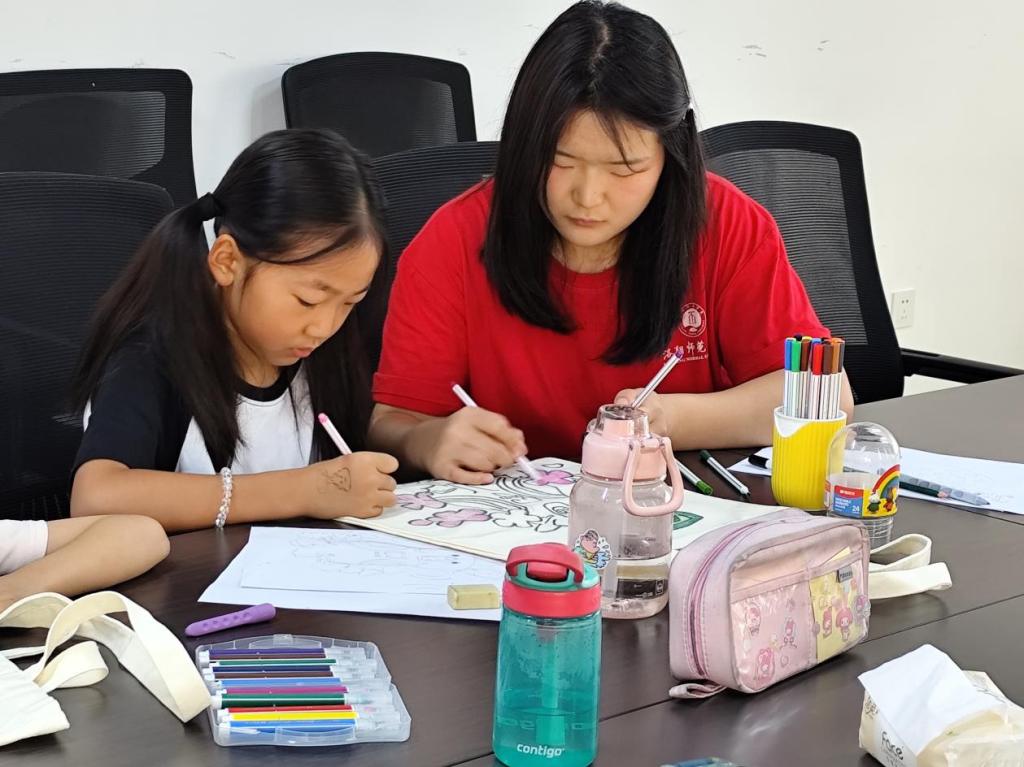 实践环节中,队员们创新采用Q版艺术形式,引导孩子们为古老的青铜器注入童趣灵魂。鸮尊圆润的轮廓、牛尊俏皮的腮红、象尊灵动的长鼻,在一双双小手的描绘下焕发出全新生命力。实践队员化身“创意助手”,或半蹲指导握笔姿势,或轻声鼓励大胆用色,当孩子们争先展示“穿花衣的牛尊”和“踩云朵的象尊”时,传统文化的传承已然在童声中绽放。