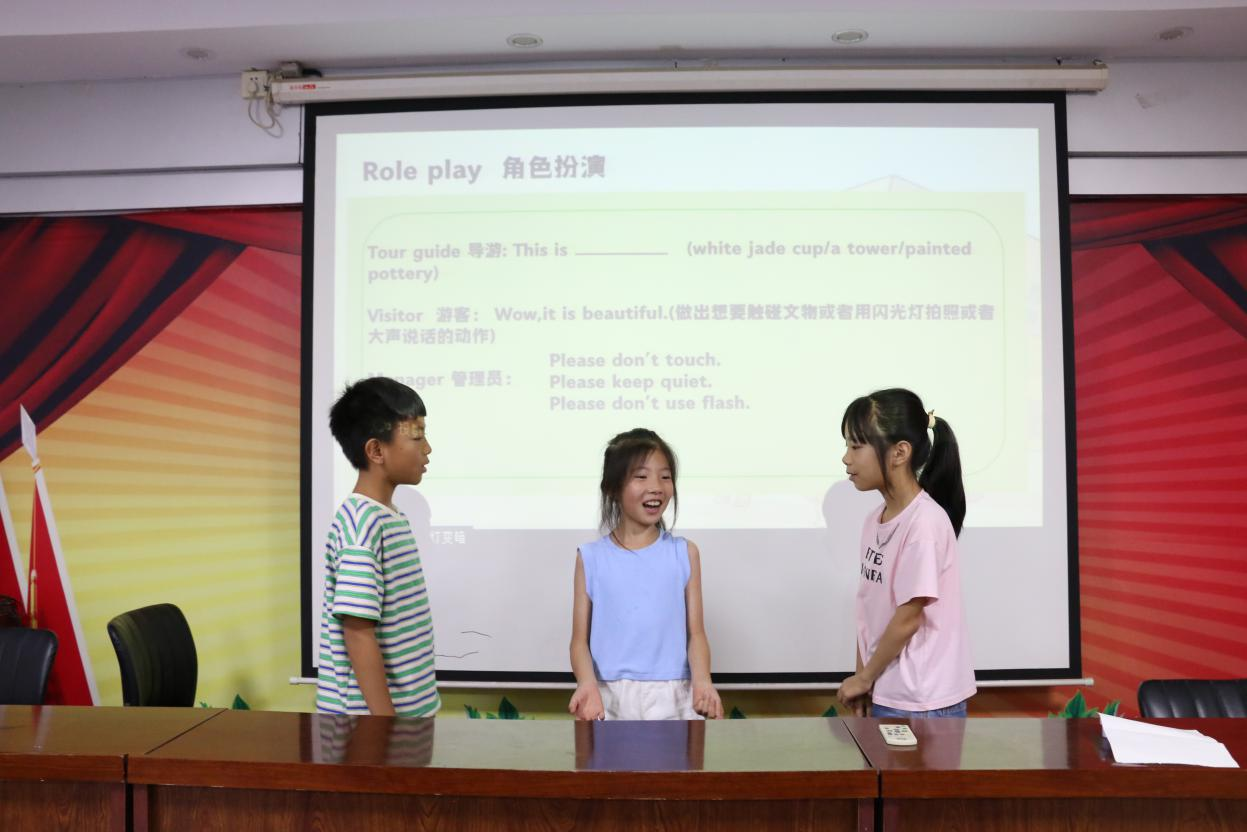 课程不止于知识的获取,更赋予孩子们守护的责任。在理论学习后,同学们郑重地佩戴特制徽章,正式成为“文物小卫士”。大家用清晰、得体的英语指出参观中的不文明行为:“Please keep a safe distance from the exhibit”、“No food or drink allowed inside, thank you”。角色扮演环节气氛热烈,大家踊跃举手,模拟用双语劝阻触摸展品、使用闪光灯拍照等场景。这一刻,“保护文物,人人有责”的理念从口号变成了孩子们身体力行的实践。