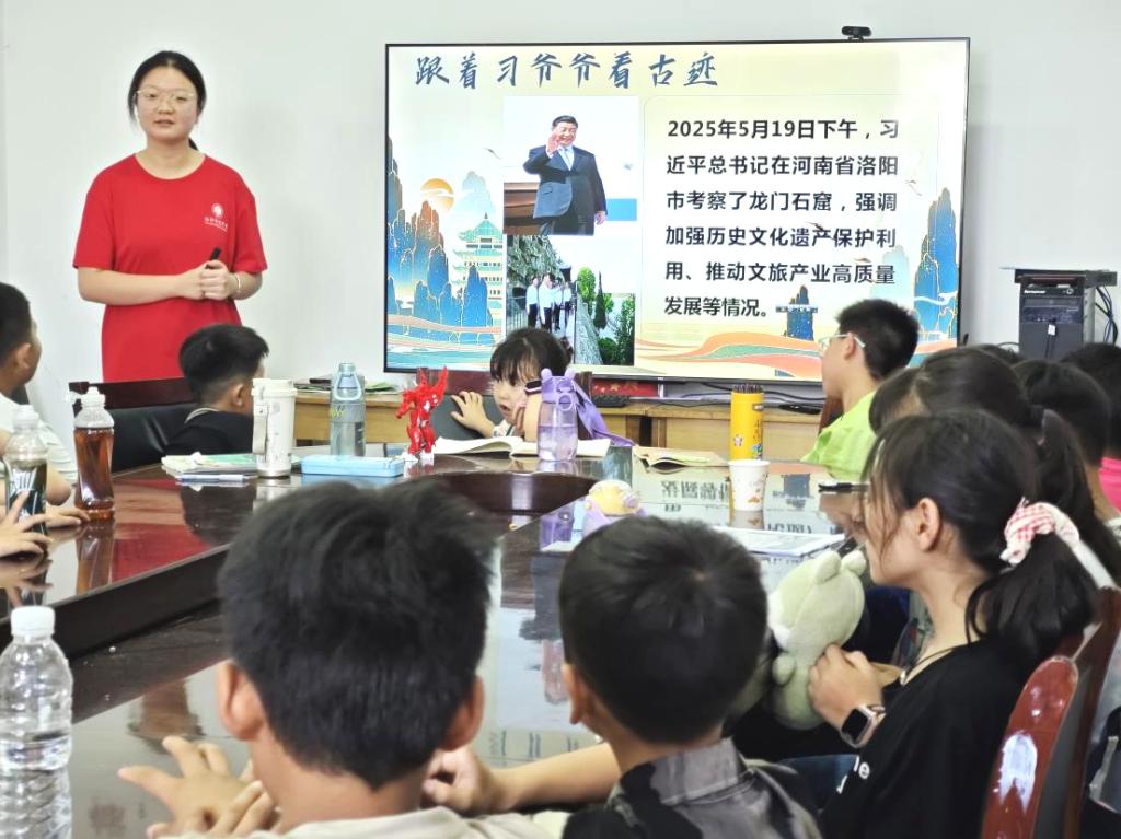 瑰宝传文脉,双语展风采。在袁付社区举办的“小外游神都”双语实践活动中,实践队员将外语学习与文旅融合体验相结合,引导青少年在云游名胜古迹的同时,用双语童声讲述千年古都的文明魅力。在洛阳博物馆,陈梓骞、郭若涵化身“小小讲解员”,用中英双语生动解说“曹魏白玉杯”“唐三彩”等珍贵文物,彰显着新时代青少年的文化自信。通过“文物小卫士”角色扮演,孩子们在模拟劝阻不文明行为中深化文物保护意识,实现语言能力与文化认同的双向提升。