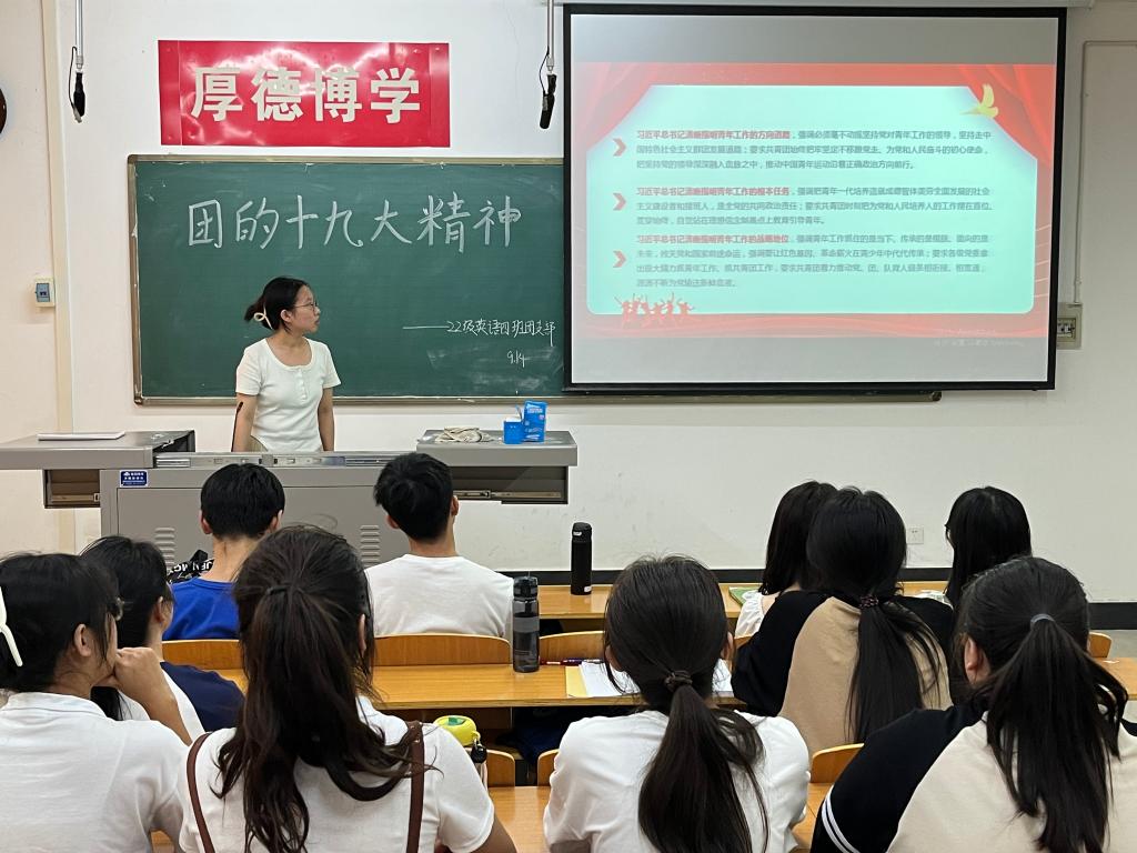 2022级英语专业四班团支部团支书张婉婷从时间、地点、内容、意义等方面向大家介绍了中国共产主义青年团第十九次全国代表大会的基本情况。团支部成员在了解到大会鼓励青年争当中国式现代化建设的生力军后,纷纷表示自己将把习近平总书记重要讲话精神和党中央决策部署落到实处,努力做有理想、敢担当、能吃苦、肯奋斗的新时代好青年。2022级英语专业二班团支部团支书王淼则以组织团支部成员线上观看团十九大视频的形式带领大家学习青年工作的方向道路、根本任务、战略地位,团员青年们深刻感悟团十九大精神,激发政治参与热情,努力学习,提高科学文化素质。其他团支部也纷纷组织支部成员进行学习。