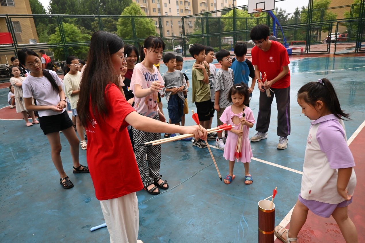 图为孩子们进行投壶比赛的场面