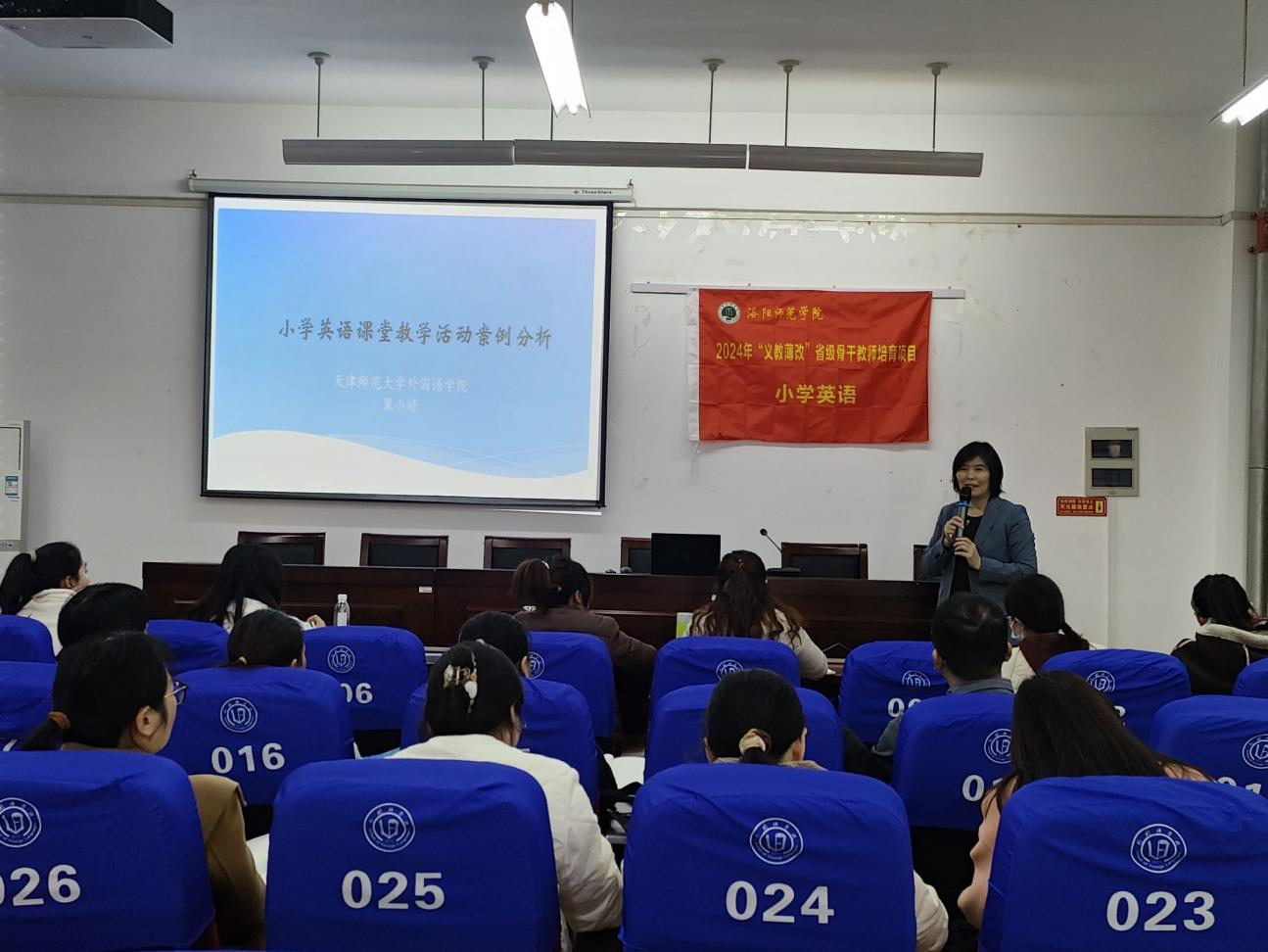 2024年11 月 29 日下午,天津师范大学外国语学院院长冀小婷教授为参训学员做了题为《小学英语课堂教学活动案例分析》的专题讲座。冀教授用拆分competence中每个字母代表的培养学生核心素养不同关键词的方式,迅速把老师们带入到了培训活动中。冀教授以具体的案例,指出老师们在教学中可以通过头脑风暴、看图写话、单语首尾接龙、创编广告语、情景联动等不同形式的活动,激活学生思维、培养学生词汇学习策略,从而落实英语学习活动观。冀教授通过对新课标的解读,让老师们明白只有将学习活动观落到实处,才能生发出课堂最精彩的课堂,让核心素养的培养目标落地。