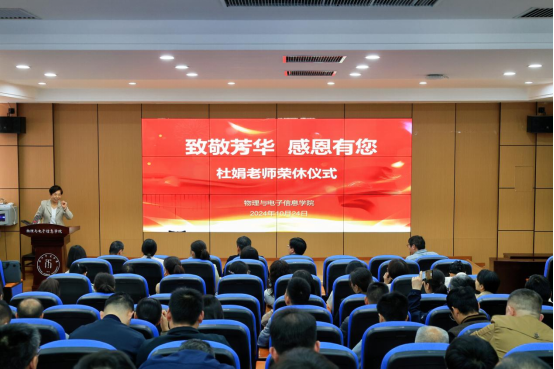 岁月染芳华,桃李育芬芳。10月24日下午,我院在物理楼报告厅举办了“致敬芳华 感恩有您”——杜娟老师荣休仪式。学院全体教职工及学生代表参加了仪式。仪式由党委副书记高小静主持。