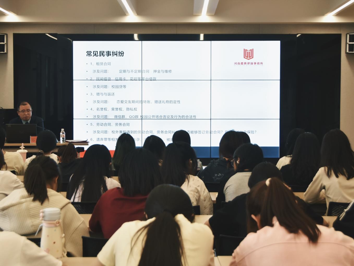 郑宝宝以“就业扬帆·法护前程”为题,分别围绕刑法和民法内容,结合典型案例,深入剖析学生就业及日常生活中可能遇到的犯罪类型、公序良俗和民事纠纷,教导同学们学法、懂法、守法,自觉用法律武器维护合法权益。郑律师还就自媒体博主、网络主播等新兴职业涉及的法律问题进行了细致解读,要求同学们不碰法律红线,严守法律底线。