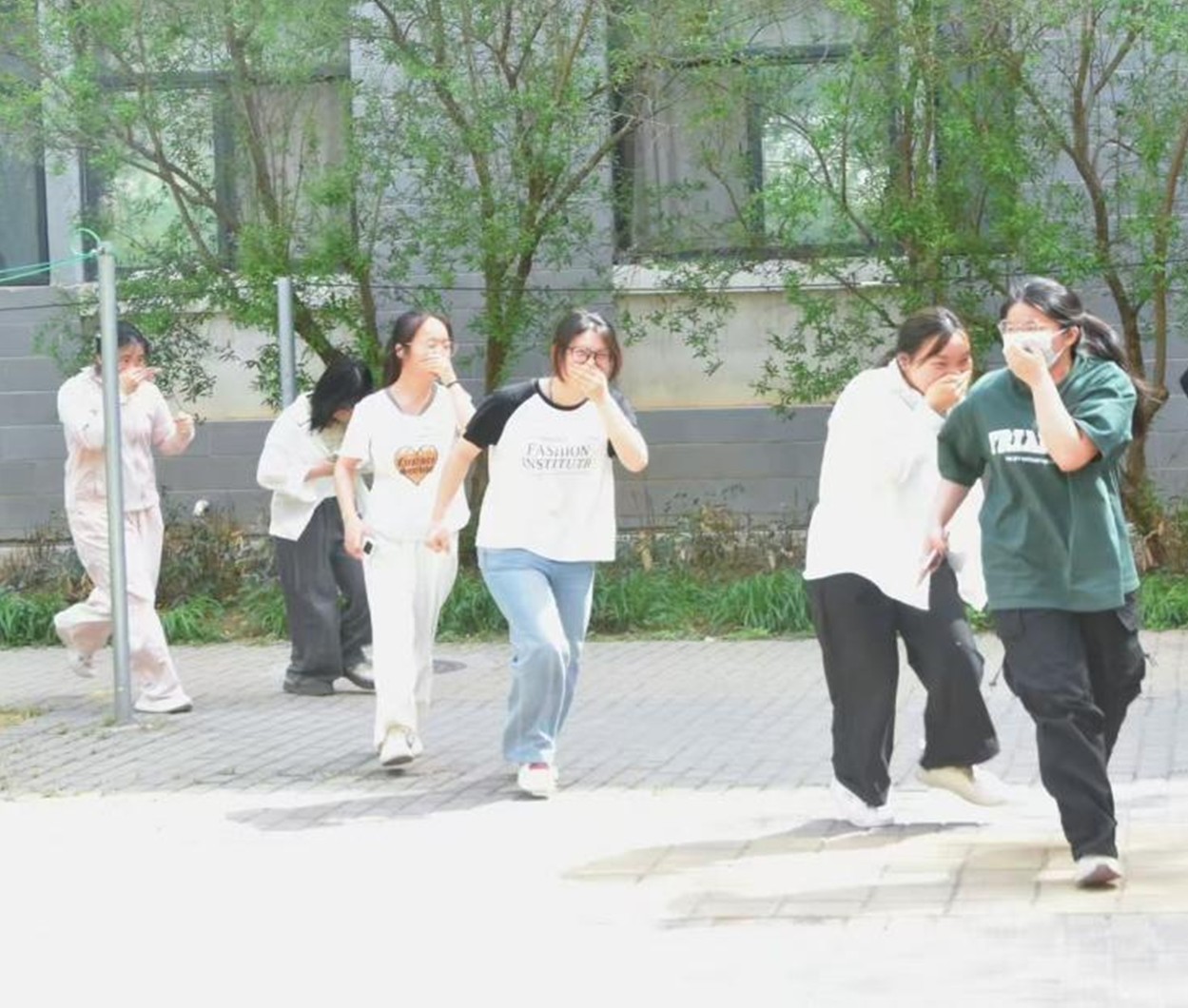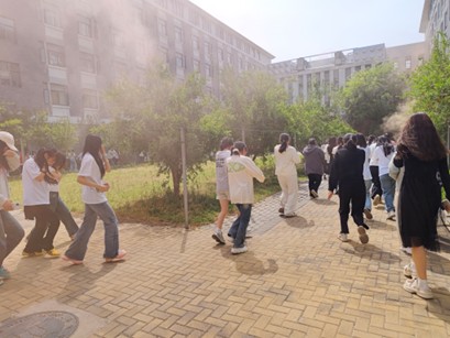 本次演练模拟宿舍楼突发火情,现场的工作人员释放了橙色烟雾,鸣起了消防警报,模拟火情发生后,学生们弯腰捂鼻,沿疏散指示标志有序撤离至安全区域,全程紧张有序。演练通过“安全全安”视频号直播,让线上的师生透过屏幕也能“身临其境”,感受紧张气氛的同时,通过观察和反思掌握逃生要领。