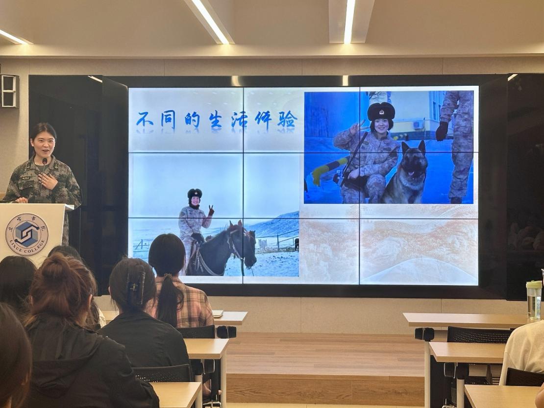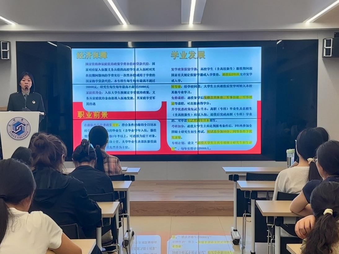 赵芳菲对入伍政策、报名基本流程、入伍待遇等进行了详细的解读。她讲到,随着国家对征兵政策的不断优化,越来越多的大学生都有了投身军营的机会,她鼓励在场青年踊跃投身军旅,为国家贡献自己的力量。李佳芯通过播放自己军旅生活的珍贵照片,向同学们展现了军营中严格的训练和深厚的战友情。她表示,虽然军旅生活充满了艰辛与挑战,但正是这些经历让她学会了坚持与奉献,收获了成长与蜕变。在问答环节,同学们积极提问,两位同学耐心解答,现场气氛热烈。