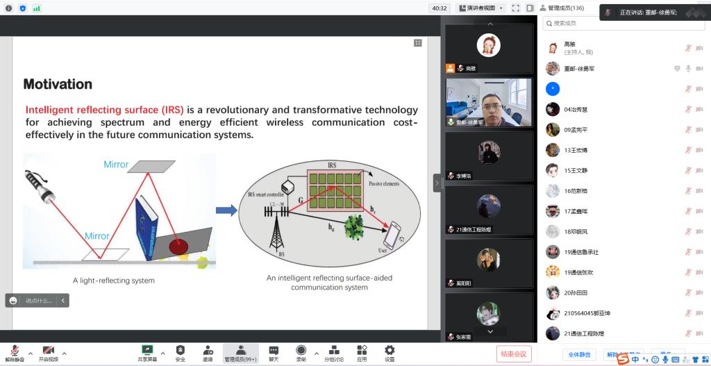 2022年10月27日,重庆邮电大学徐勇军教授应邀为我院师生带来了一场题为“智能反射表面辅助的无线能量传输通信网络研究”的学术报告。本次学术讲座通过腾讯会议在线上进行,我院电子信息工程、通信工程专业相关老师和学生参加了此次讲座。