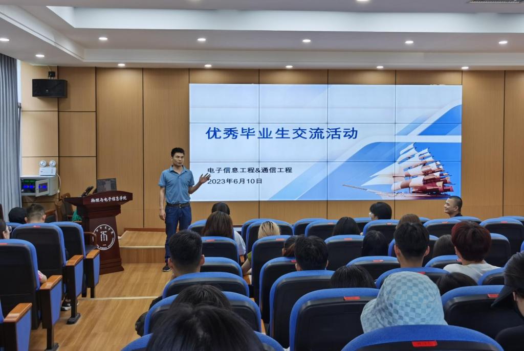 为帮助学生培养专业兴趣,建立专业自信,合理规划学业和职业生涯,6月10日上午,由招生就业处主办,物理与电子信息学院承办的启梦大讲堂系列讲座之“发挥校友榜样示范作用 助力学业和职业生涯规划”在物理楼报告厅举行。讲座邀请电子信息工程和通信工程专业优秀校友2021届毕业生曲建新、2018届毕业生焦旭成、2011届毕业生张厚轩、2010届毕业生李光耀及2021届毕业生符慧娟分享成长经验,我院副院长夏玉杰及教师代表参加本次讲座。讲座由电子信息工程专业主任崔建华主持。
