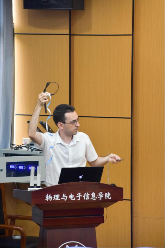Vasilii老师介绍了常用信号发射装备的数据传输特点、数据显示方法,以及无线通信所面临的威胁及防御方法,向同学们展示了生活中常见电波的记录情况,激发了同学们的学习热情和兴趣。