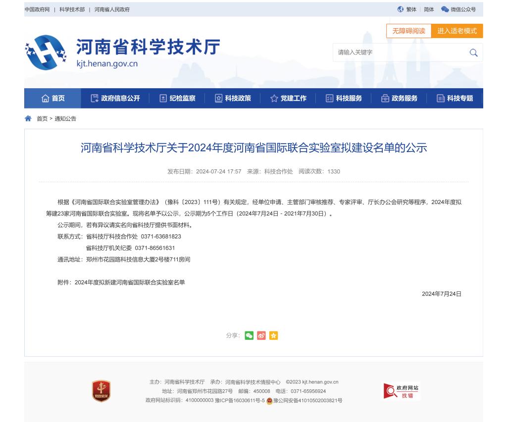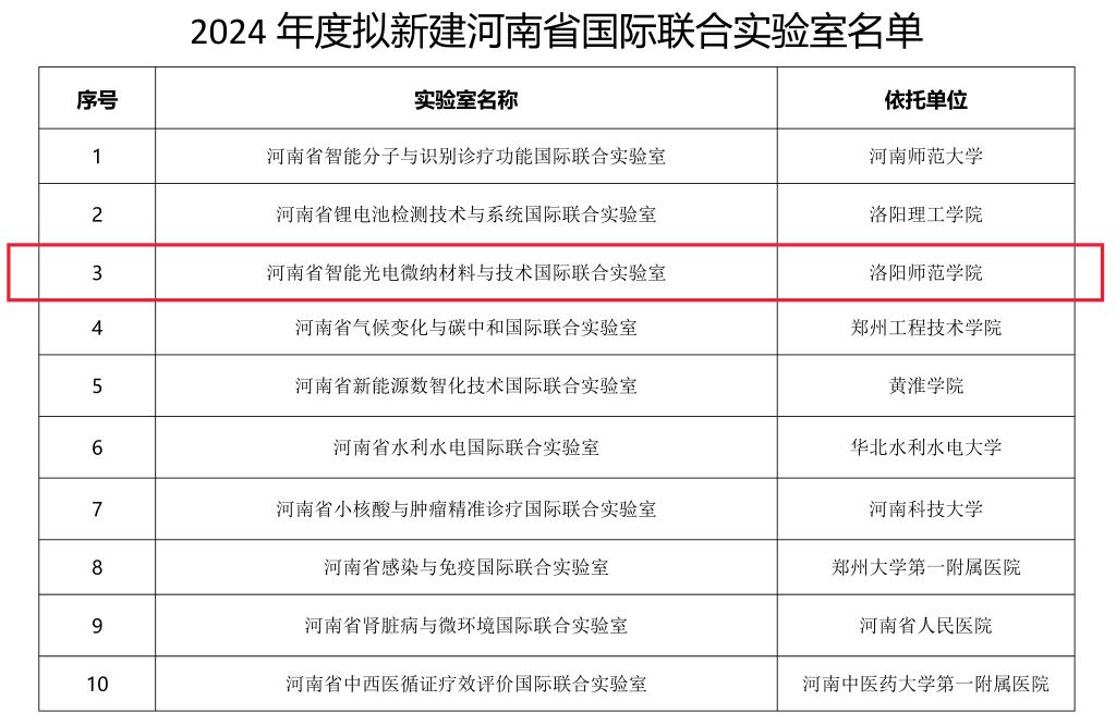 根据《河南省国际联合实验室管理办法》(豫科〔2023〕111号)有关规定,经我院深入论证申请、主管部门审核推荐、专家评审等程序,7月24号河南省科技厅公示:洛阳师范学院与英国爱丁堡大学、白俄罗斯国立信息与无线电大学共建的“河南省智能光电微纳材料与技术国际联合实验室”获批筹建。
