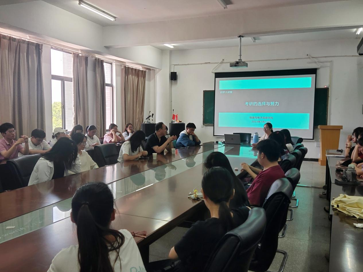 7月10日下午,由我校招生就业处主办、物理与电子信息学院承办的启梦大讲堂系列讲座之“考研的选择与努力”在A11-305会议室举行。本次讲座由武汉大学博士、郑州大学第一附属医院临床医学系副研究员、我校2012届物理学优秀毕业生韩滨担任主讲人,物理与电子信息学院2020级和2021级部分学生参加了本次讲座。