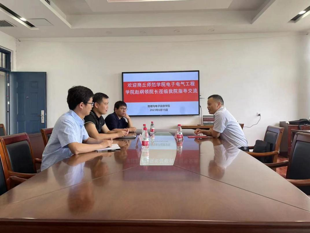 6月15日,商丘师范学院电子电气工程赵纲领院长到我院考察交流,交流会在物理楼317会议室举行。我院院长彭枫、副院长赵国清、骨干教师贾红博士参加交流会。