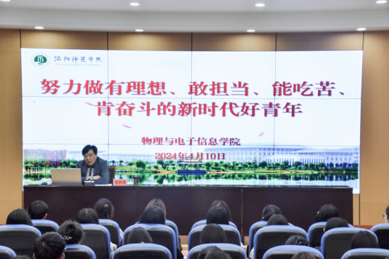 为认真落实立德树人根本任务,凝心铸魂,不断增强学生干部的理想信念和工作能力,发挥好先锋榜样作用,4月10日,我院党委书记席明旺在物理楼报告厅为全体学生干部讲授题为“做有理想、敢担当、能吃苦、肯奋斗的新时代好青年”的思政课。