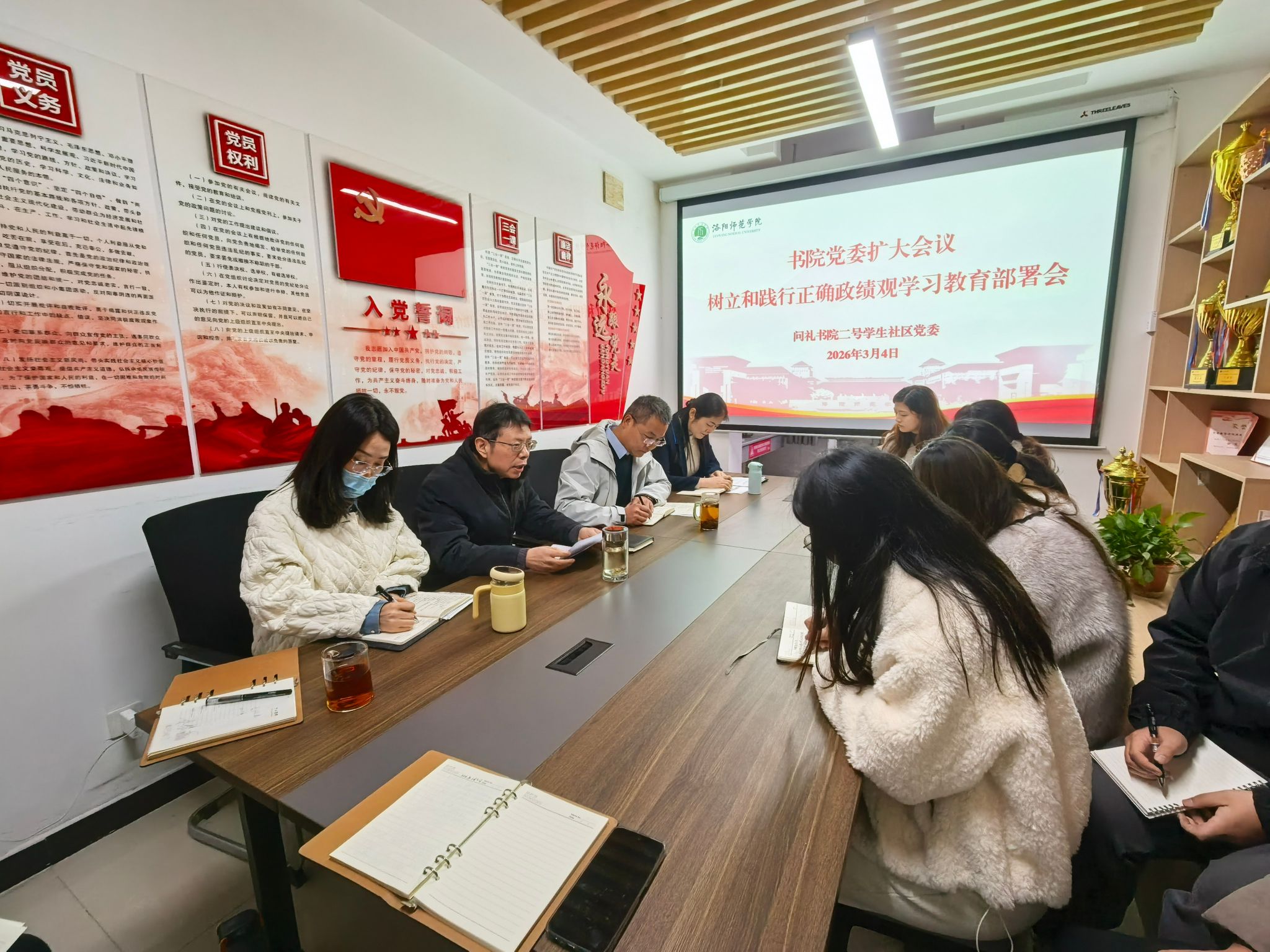 3月4日,书院社区在党建活动室召开党委扩大会议,就开展树立和践行正确政绩观学习教育进行动员部署。班子成员、各党支部书记及育人导师(辅导员)参加会议。参加会议。会议由书院社区党委书记褚卫东主持。