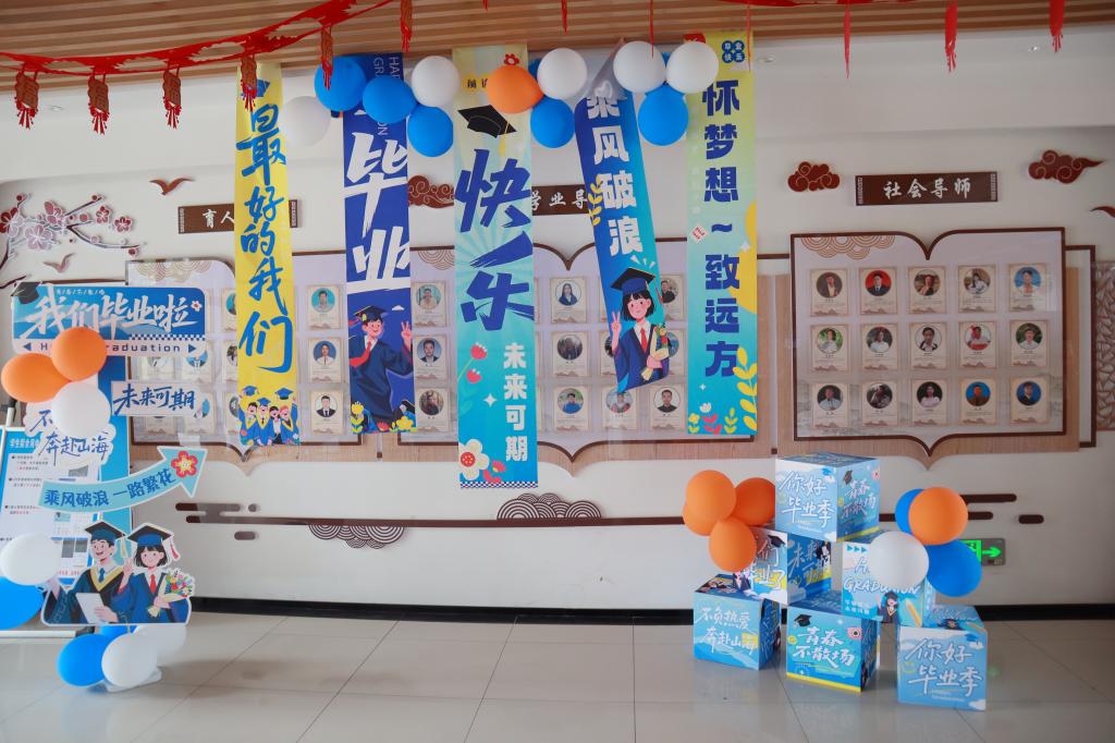 书院在宿舍大厅进行了别具匠心的毕业季主题布置。大厅里设置了毕业主题打卡点,祝福标语与特色装饰交相辉映,每一处细节都洋溢着对毕业生的美好祝愿。同时,感人至深的毕业季纪念视频循环播放,画面中青春的点滴一一浮现,温暖的祝福传递到每一位毕业生的心间,极大地提升了毕业季的仪式感。
