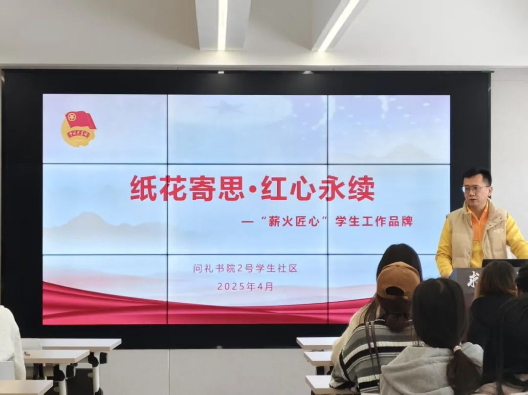 为传承红色基因,赓续精神血脉,弘扬爱国主义情怀,问礼书院2号学生社区于4月3日下午在二楼求真学堂举办“薪火匠心——‘纸花寄思·红心永续’红色家书诵读会”。书院团委书记杜慧龙及30余名学生共同参与,以书信追忆先烈,以纸花寄托哀思。