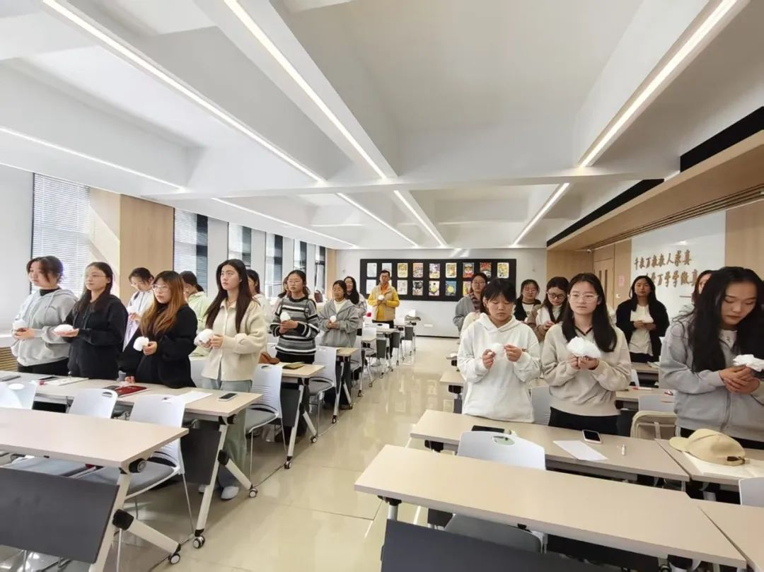 活动尾声,全体师生轻放纸花于长桌之上。素白与赤红的花瓣层层铺展,如星火聚成光河。灯光渐暗,会场陷入片刻静默,唯有纸花在风中微颤,仿佛与英魂低语。有学生垂首闭目,将掌心覆于花上;有人凝视花瓣,任泪水无声滑落。