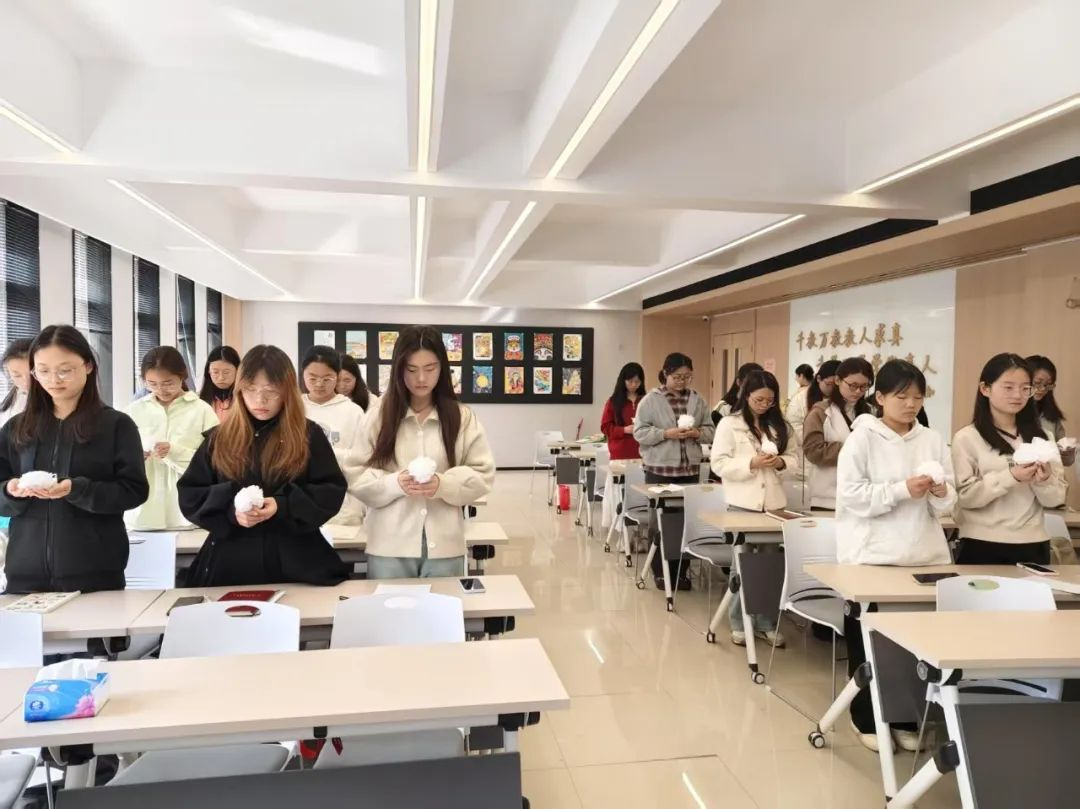 在“手工纸花制作”环节,杜慧龙详细讲解纸花制作技艺的历史渊源与象征意义。同学们手持素纸、细铁丝等材料,折瓣、塑形、扎结,将缅怀之情倾注于指尖。一朵朵白菊与红莲渐次绽放,既是对先烈的无声祭奠,亦是对红色精神的具象传承。青马班学员表示:“纸花虽轻,却承载着我们对英雄的敬意与继承遗志的决心。”