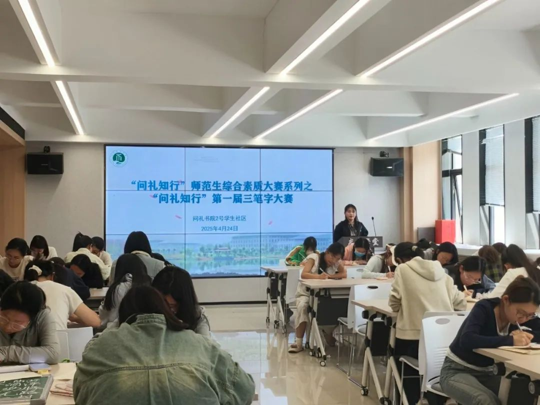 一支笔,传承千年文化;一方纸,书写师道礼韵。 4月24日,问礼书院2号学生社区在书院求真学堂举办“翰墨传薪火,师道承礼韵”三笔字技能大赛,同学们以硬笔、粉笔、软笔为媒,在横竖撇捺间展现文字之美,诠释对传统文化与师道精神的敬意。
