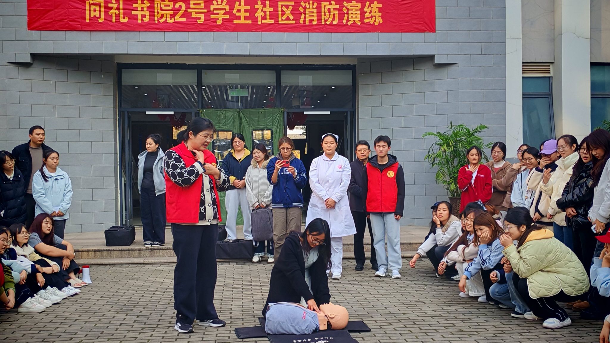 为切实增强师生消防安全意识与应急救护能力,11月13日,问礼书院二号学生社区开展“全民消防,生命至上”消防疏散演练与急救技能培训活动。书院社区领导班子、各年级育人导师及2025级新生参加。