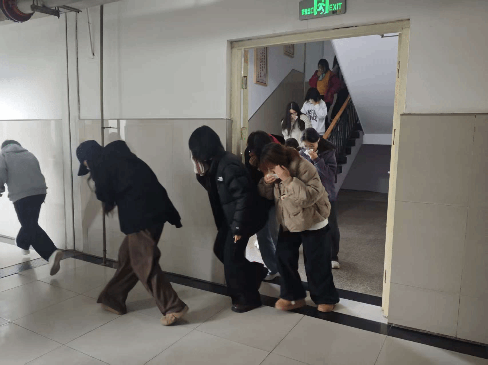随着模拟火情警报响起,应急疏散程序立即启动。在疏散过程中,师生们沉着冷静,按照预案要求捂住口鼻、弯腰低姿,沿疏散指示标志迅速有序撤离。经各楼层长清点上报,实现“零遗漏、全撤离”的预期目标。党委书记褚卫东充分肯定了师生们在演练中的快速反应与协同配合,强调“演练不是演戏”,要切实将安全技能转化为“肌肉记忆”,在真实险情中把握生机。尚玲玲提醒师生严格遵守学校住宿管理相关规定,注意用电安全,做到人走断电、拔电,不断强化安全意识,切实提升应急反应能力。