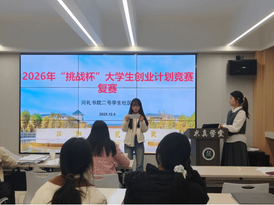 为深化创新创业教育,激发学生创新思维与创业潜能,问礼书院二号学生社区于12月4日在求真学堂举办2025年“挑战杯”大学生创业计划竞赛复赛。邀请教育科学学院副院长杨红军、学前教育学院副院长吉喆以及学业导师谢山莉、谷渊博四位教师担任评委。