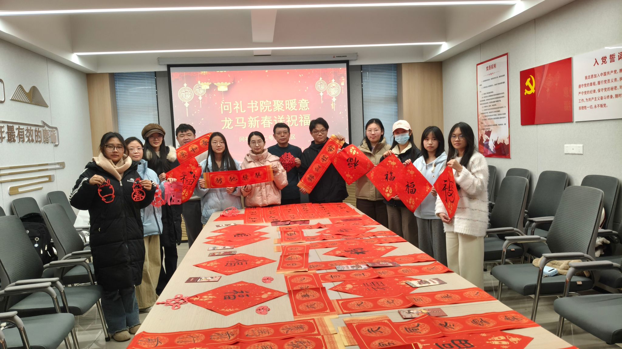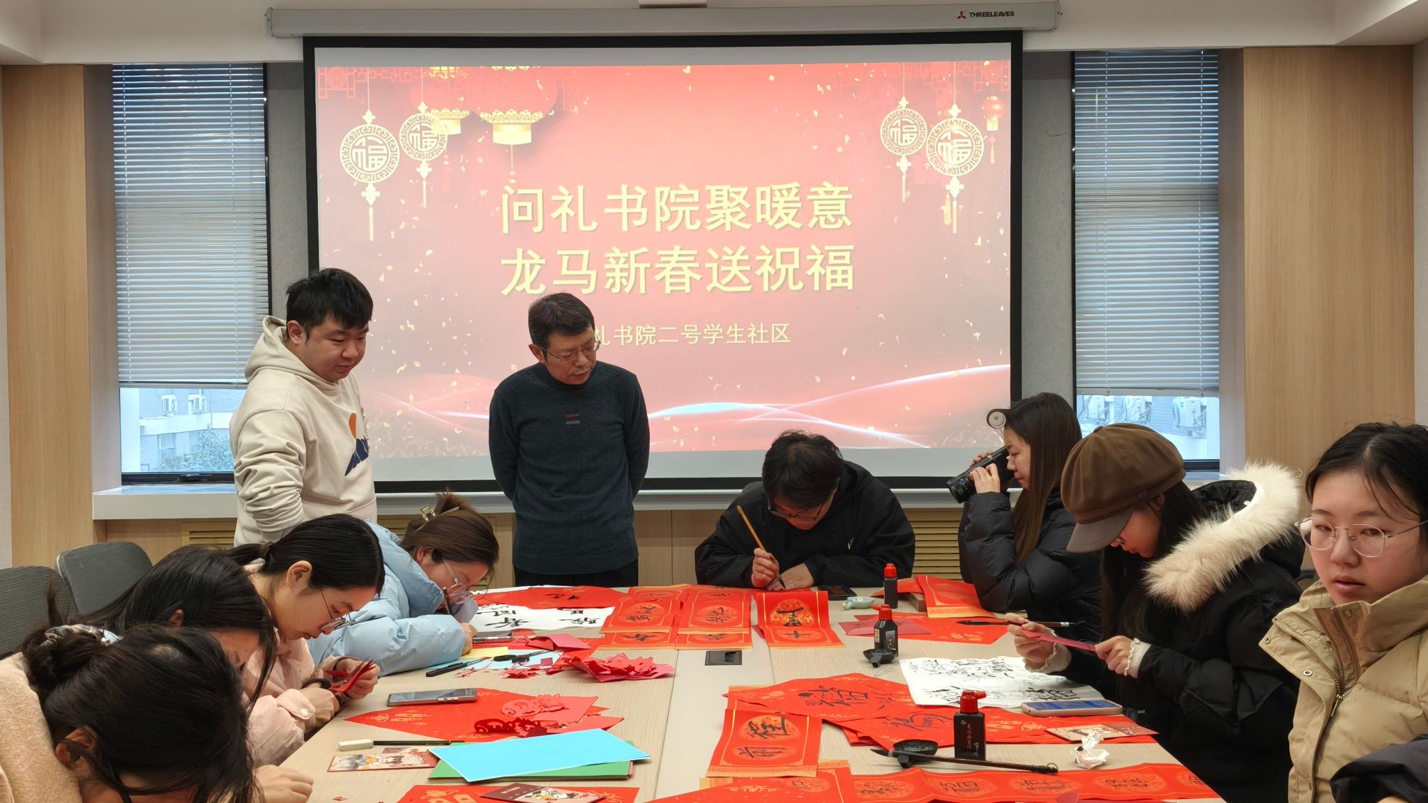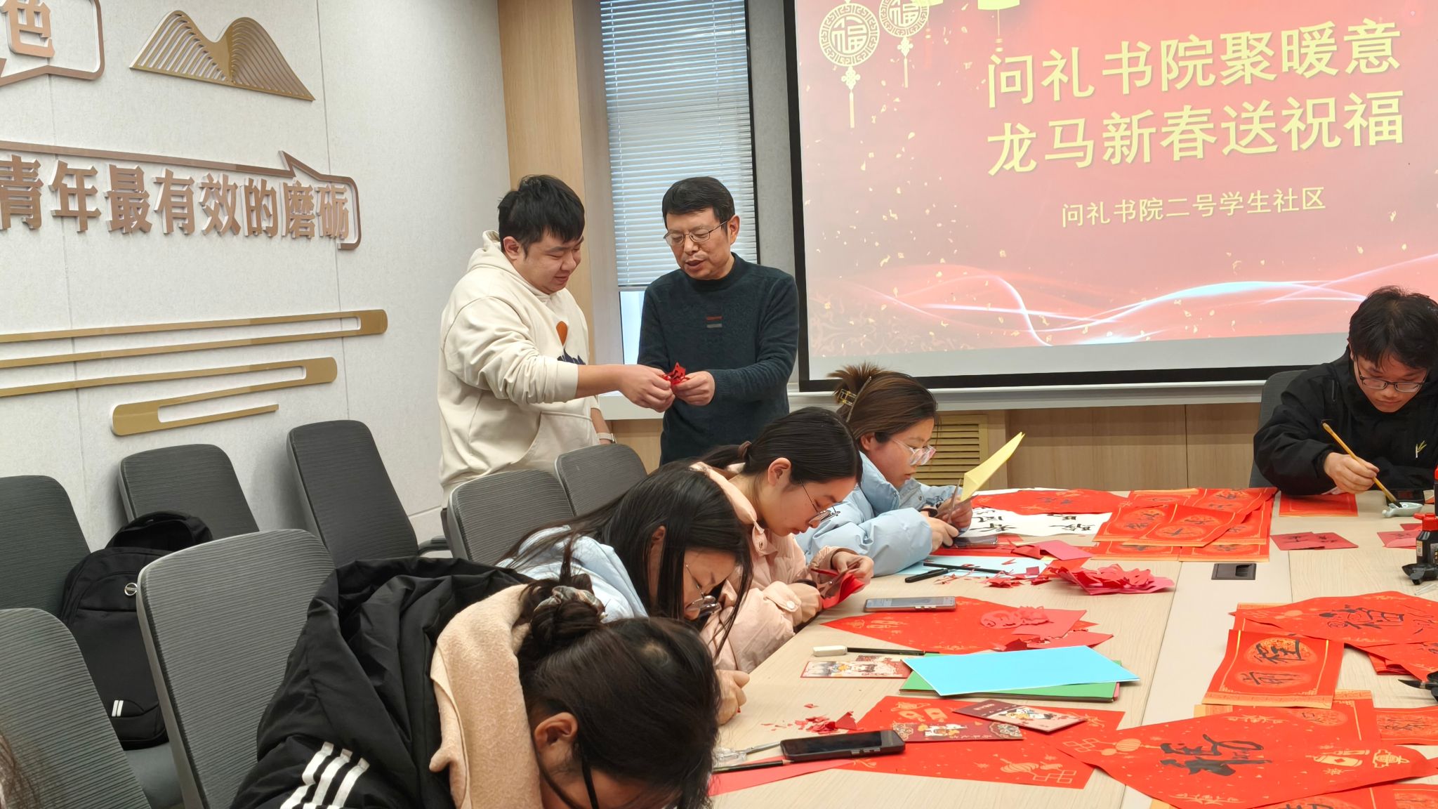 岁序更新,新春将至。为传承中华优秀传统文化,营造喜庆祥和的书院氛围,1月3日下午,问礼书院二号学生社区开展了“问礼书院聚暖意,龙马新春送祝福”对联书写与剪纸创作活动。红纸铺展,墨香飘散,剪刀轻舞,师生齐聚一堂,在动手体验中提前感受浓浓的年味。