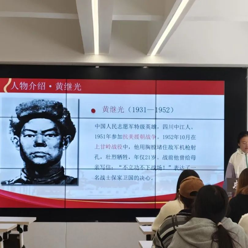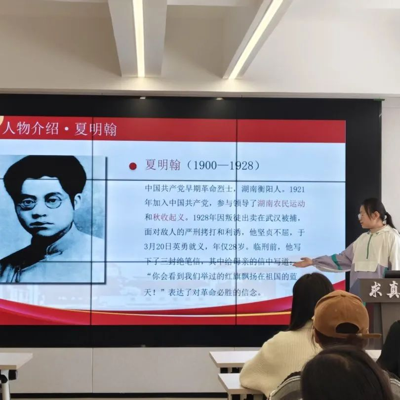 活动伊始,青马班学生深情演绎革命烈士的家书与他们的事迹。夏明翰“砍头不要紧,只要主义真”的铮铮誓言、黄继光“不立功不下战场”的豪迈决心,通过书信诵读与感悟分享,跨越时空直抵人心。随后,三位同学通过情景剧形式再现赵一曼被捕就义的壮烈场景,诵读其留给幼子的绝笔信:“母亲不厌其烦,将来教育你,就用实行来教育你……”字字泣血,令在场师生动容。杜慧龙总结道:“烈士的信仰如炬火,照亮后人前行的路。”
