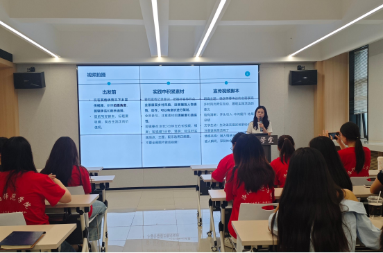 育人导师王俊娣和李雨霏围绕外宣工作进行培训。王俊娣以新闻稿撰写的“新、实、精”为核心要点,深入讲解了如何撰写具有吸引力和可读性的新闻稿,详细介绍了短视频制作的创意与传播逻辑,为同学们提供了全方位的外宣指导。李雨霏聚焦于宣传工作的重要性和技能要求,从照片视频拍摄构图的基本原则,到如何赋予内容故事感等方面进行了深入教学。