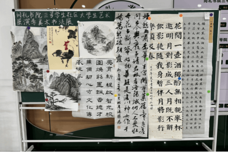 11月6日,问礼书院三号学生社区大学生艺术展演暨艺术类作品展在书院一楼大厅拉开帷幕,绘画、书法、手工三类作品集中展出,充分呈现出了书院学生们的创意与艺术表达力。