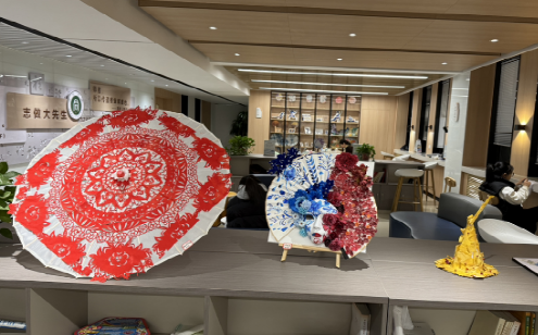 展览现场,绘画作品涵盖版画、水彩、线描等形式,题材既包含传统瑞兽、民俗意象,也融入现代抽象风格,以线条与色彩的碰撞展现出多元审美;书法作品以诗词、校园文化主题为内容,行书、楷书等书体兼具笔力与韵味,传递出文字艺术的张力;手工类作品则以剪纸伞、装饰面具等形式呈现,传统工艺与创意设计结合,细节处体现巧思。