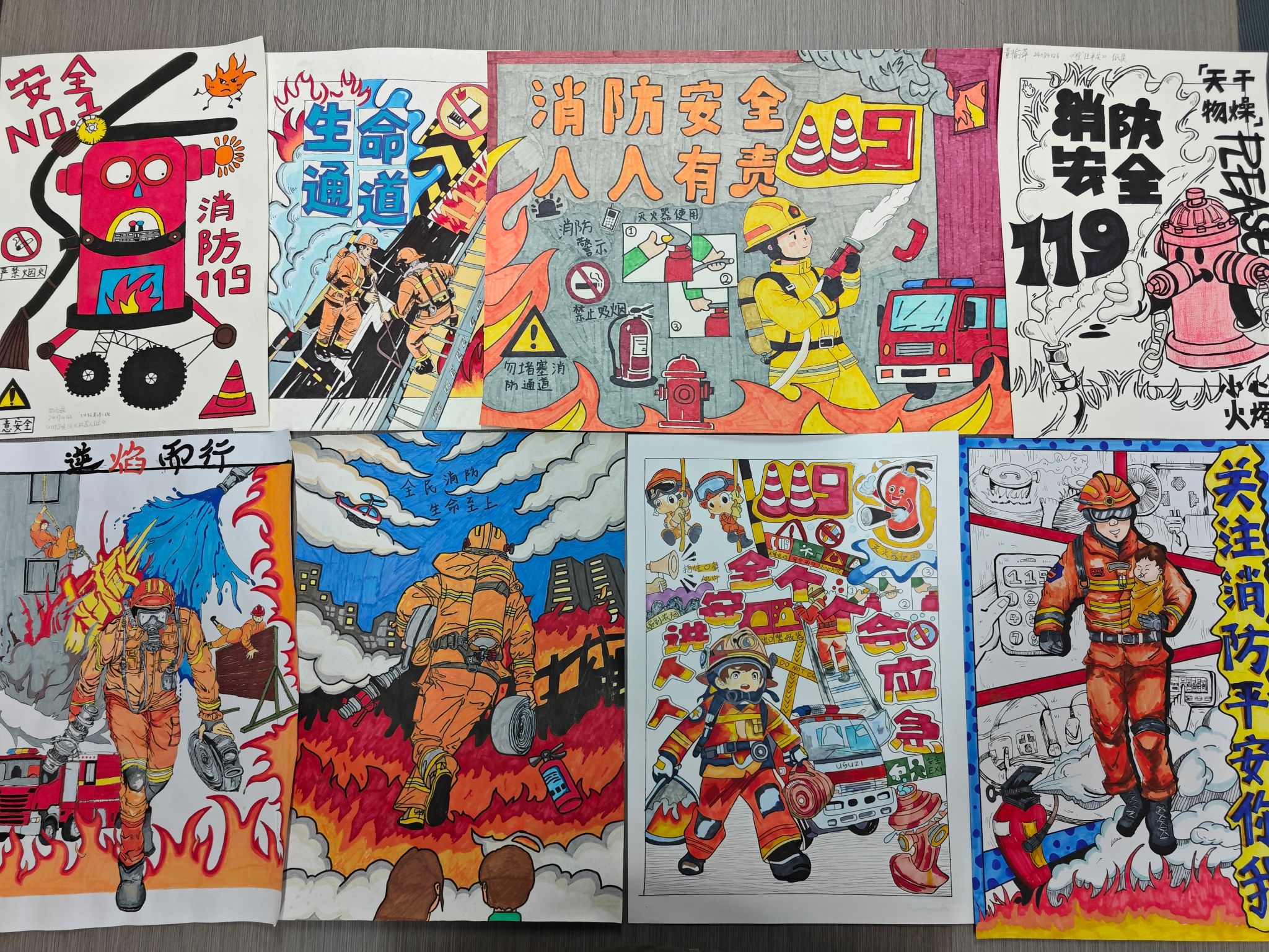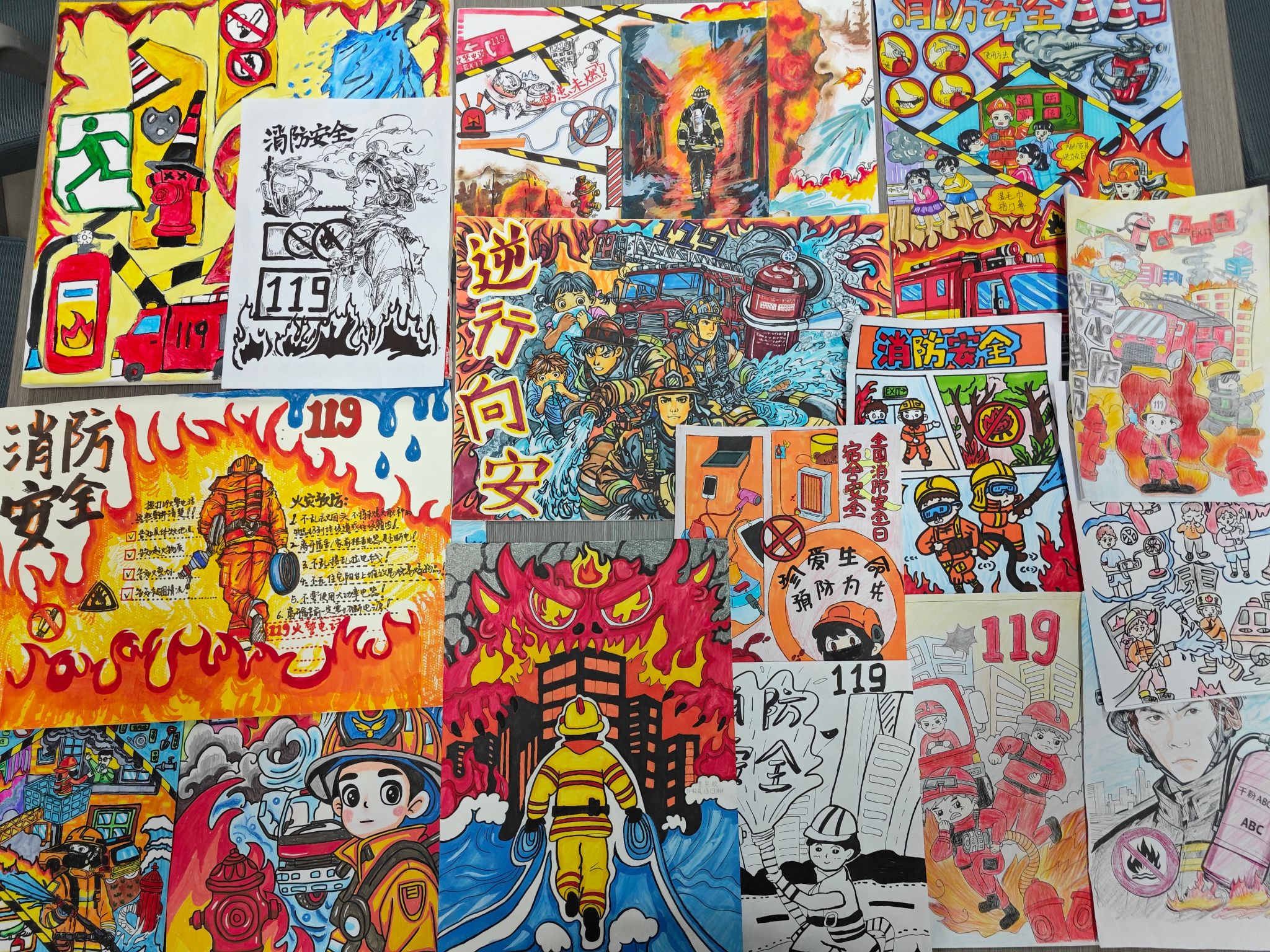 本次比赛围绕“消除火患,共绘平安”主题,设立了消防器材认知、火场逃生技巧、宿舍防火警示、消防员形象塑造、消防安全标语创意五大作品主题,学生们通过海报与漫画两种形式,以视觉艺术表达对消防安全的理解与重视。参赛作品创意纷呈,既有严谨细致的消防器材图解,也有生动形象的火场逃生情景描绘;既有对宿舍常见隐患的深刻警示,也有对消防员英勇形象的艺术塑造。