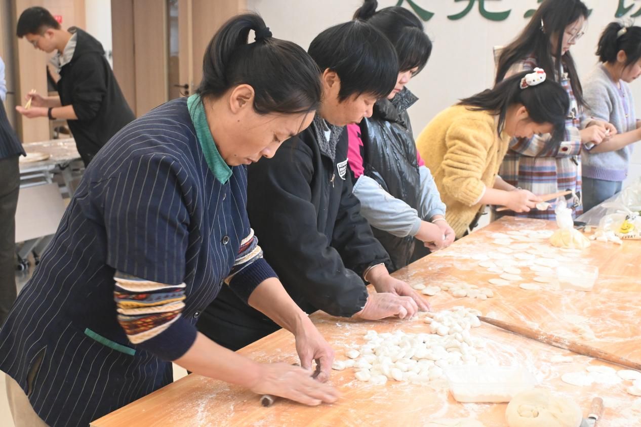 活动现场气氛热烈,暖意融融。书院社区负责人详细介绍了冬至节气的文化内涵与食饺习俗,强调了其在中华民族传统岁时文化中的重要地位,并阐述了本次活动旨在通过亲手实践,让同学们感受传统、体验协作、传递关爱。活动开始后,同学们在生活导师、育人导师的指导下认真学习、积极动手,很快掌握擀皮技巧和捏合手法,并互相交流家乡的饺子包法、冬至习俗,分享学习与生活中的趣事,欢声笑语不断。