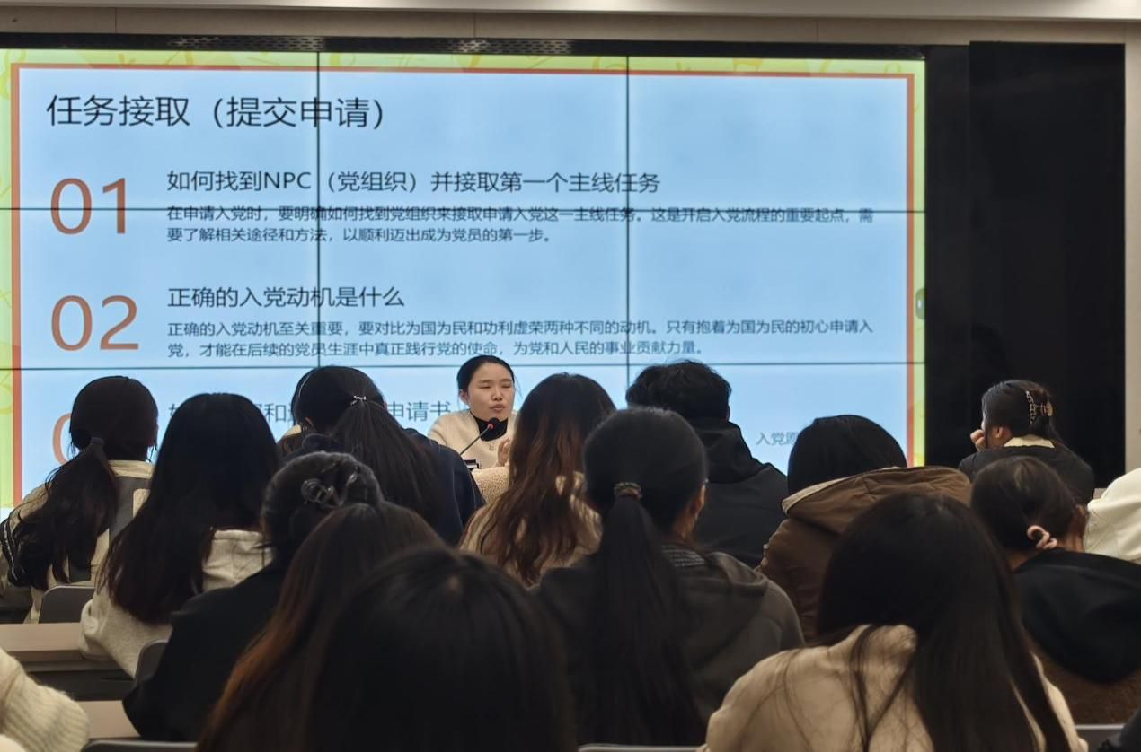 10月20日晚,问礼书院三号学生社区党建与思政办公室主任尚瑞雪在大先生讲堂,为书院入党积极分子讲授了题为 《“打怪升级”之路——聊聊共产党员的“修炼手册”》 专题党课。