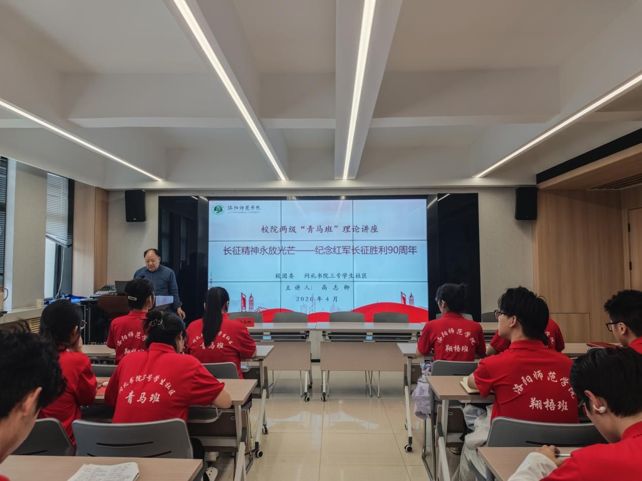 为纪念红军长征胜利90周年,传承红色基因、厚植青年理想信念,4月2日下午,学校团委联合问礼书院三号学生社区在书院社区二楼大先生讲堂举办“青马班”理论讲座。本次讲座以《长征精神永放光芒——纪念红军长征胜利90周年》为题,邀请学校“五老”宣讲团团长、校关工委委员高志卿担任主讲人,校团委翔梧班、书院社区青马班、马克思主义学院永信班全体学员参加培训,共同接受红色精神洗礼。