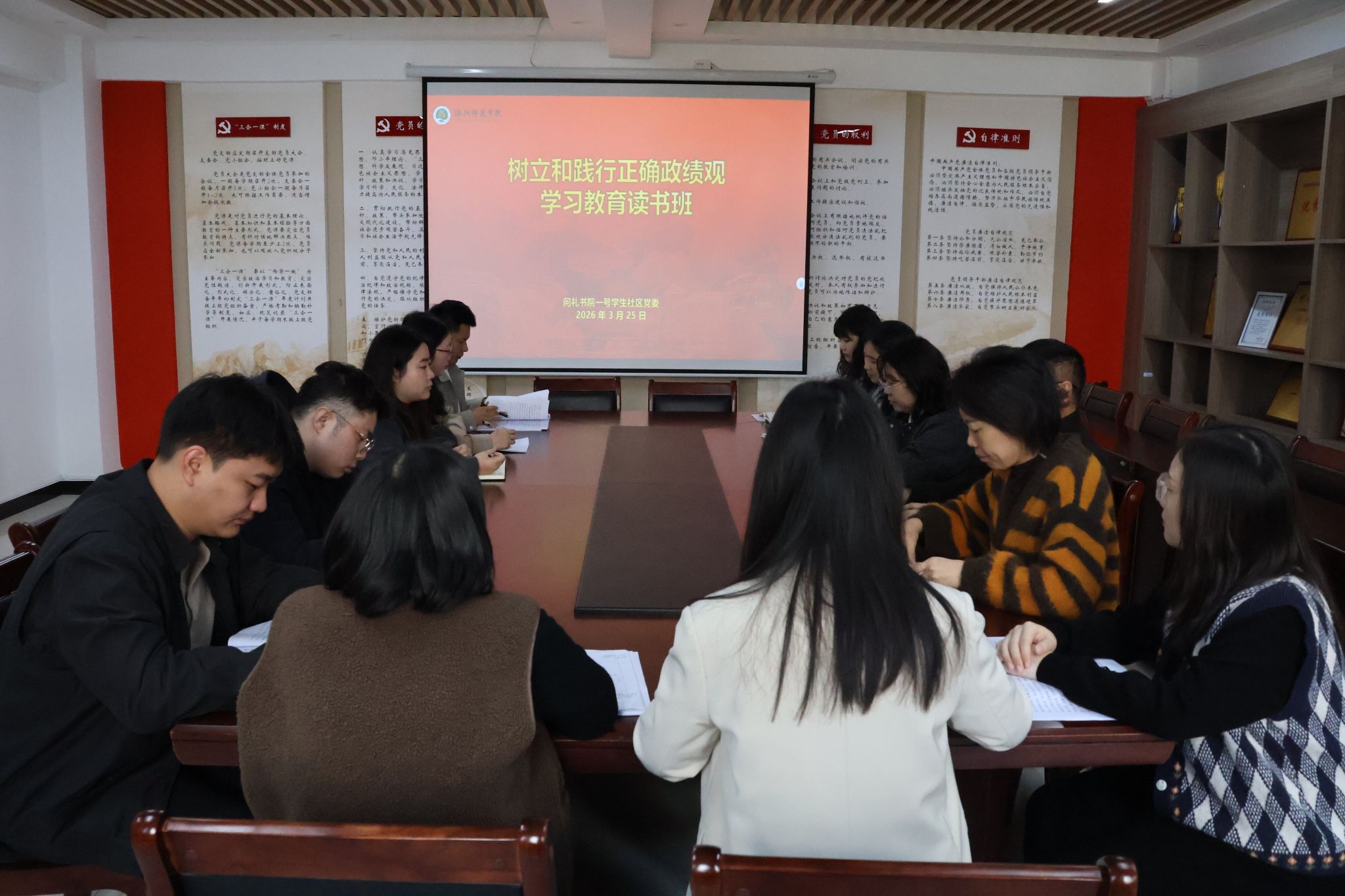 根据学校党委关于开展树立和践行正确政绩观学习教育工作安排,3月25日至26日,问礼书院一号学生社区党委通过集体学习、个人自学和交流研讨等方式,举办树立和践行正确政绩观学习教育读书班。社区党委书记曹嘉主持会议。社区领导班子成员、全体育人导师参加学习。