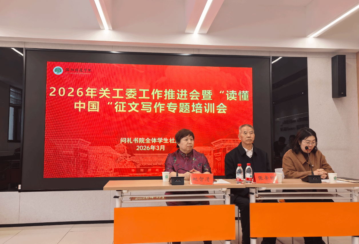 为扎实推进“读懂中国”主题教育活动,提升学生征文创作能力,3月26日,问礼书院在一号学生社区问礼大讲堂召开2026年关工委工作推进会暨“读懂中国”征文写作主题培训会。校关工委常委副主任张辛卯,洛阳师范学院退休教师姚智清教授,问礼书院三个学生社区负责人、育人导师(辅导员)和学生代表参加会议。问礼书院一号学生社区党委副书记谭音主持会议。